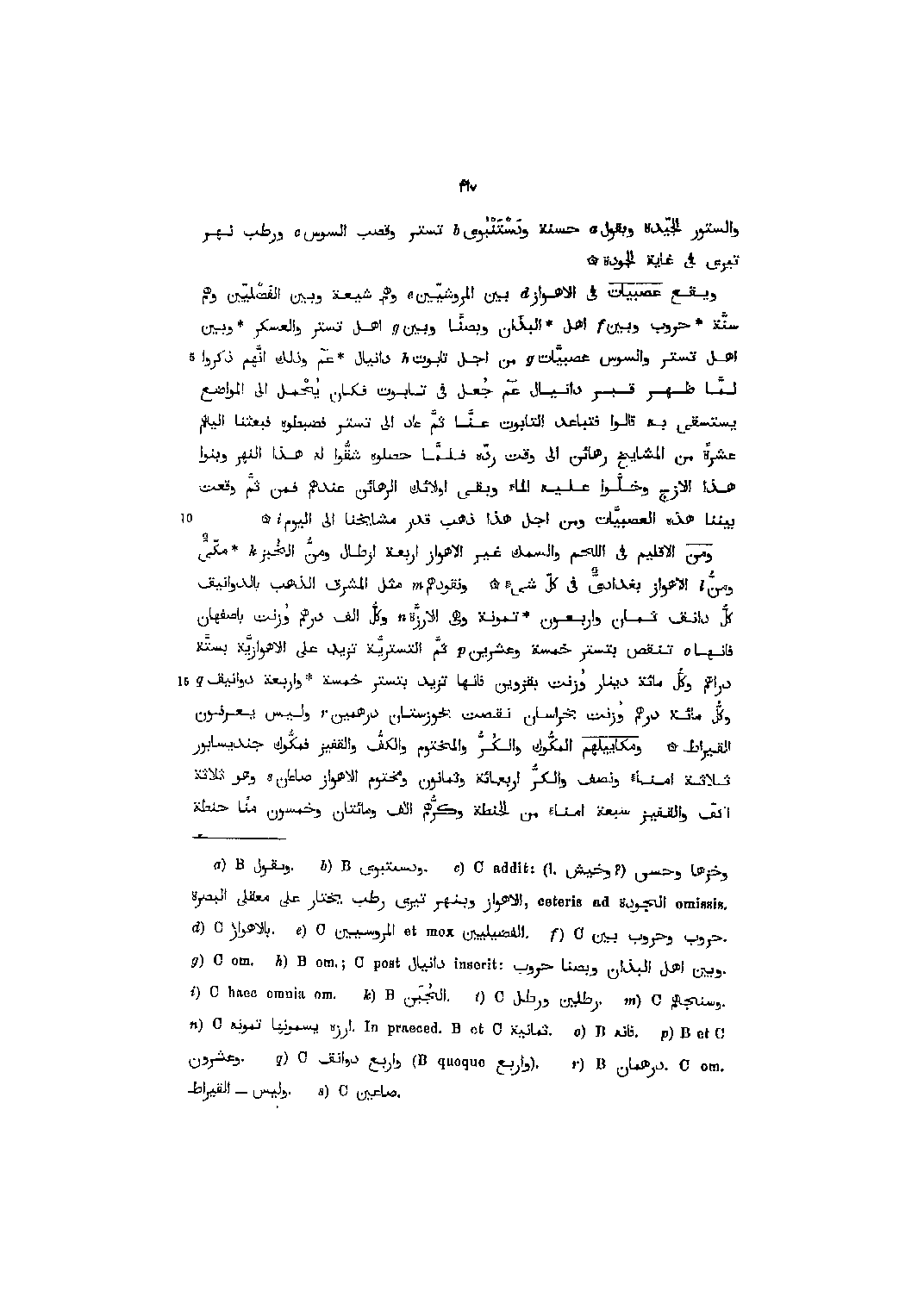 والستور الجيّدة وبقول [1] حسنة ودستنبوى [2] تستر وقصب السوس [3] ورطب نهر تيري في غاية الجودة ويقع عصبيات في الأهواز [4] بين المروشيّين [5] وهم شيعة وبين الفضليّين وهم سنّة حروب وبين [6] أهل البذان وبصنّا وبين [7] أهل تستر والعسكر وبين أهل تستر والسوس عصبيّات [7] من أجل تابوت [8] دانيال عم وذلك انّهم ذكروا لمّا ظهر قبر دانيال عم جعل في تابوت فكان يحمل الى المواضع يستسقى به قالوا فتباعد التابوت عنّا ثمّ عاد الى تستر فضبطوه فبعثنا اليهم عشرة من المشايخ رهائن الى وقت ردّه فلمّا حصلوه شقّوا له هذا النهر وبنوا هذا الأزج وخلّوا عليه الماء وبقي اولائك الرهائن عندهم فمن ثمّ وقعت بيننا هذه العصبيّات ومن أجل هذا ذهب قدر مشايخنا الى اليوم [9] ومن الإقليم في اللحم والسمك غير الأهواز اربعة أرطال ومن الخبز [10] مكّىّ ومن [11] الأهواز بغداديّ في كلّ شيء ونقودهم [12] مثل المشرق الذهب بالدوانيق كلّ دانق ثمان وأربعون تمونة وهي الارزّة [13] وكلّ ألف درهم وزنت بأصفهان فإنها [14] تنقص بتستر خمسة وعشرين [15] ثمّ التستريّة تزيد على الاهوازيّة بستّة دراهم وكلّ مائة دينار وزنت بقزوين فإنها تزيد بتستر خمسة واربعة دوانيق [16] وكلّ مائة درهم وزنت بخراسان نقصت بخوزستان درهمين [17] وليس يعرفون القيراط ومكاييلهم المكّوك والكرّ والمختوم والكفّ والقفيز فمكّوك جنديسابور ثلاثة أمناء ونصف والكرّ اربعمائة وثمانون ومختوم الأهواز صاعان [18] وهو ثلاثة اكفّ والقفيز سبعة أمناء من الحنطة وكرّهم ألف ومائتان وخمسون منا حنطة