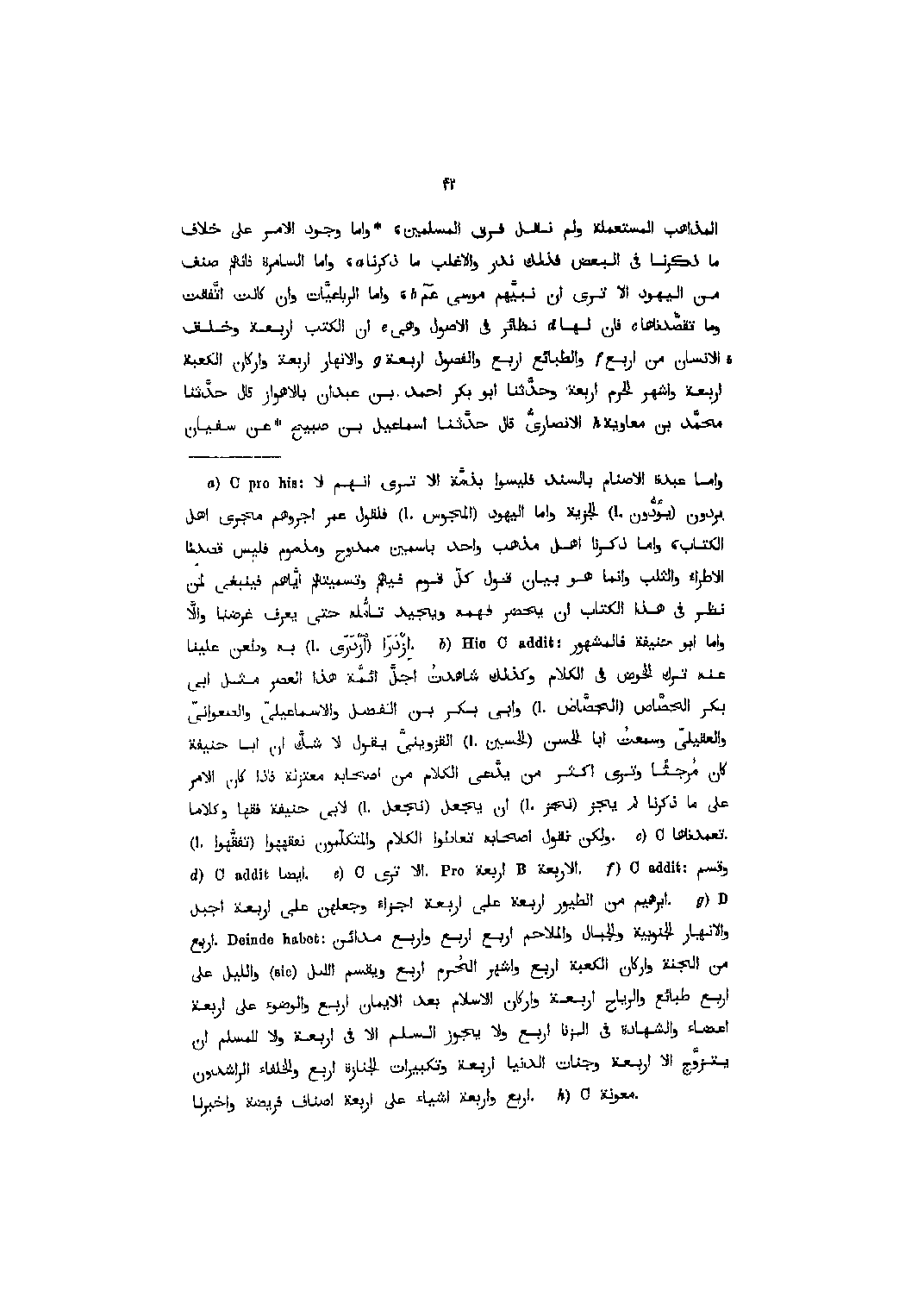 [2] واما ابو حنيفة فالمشهور HicCaddit:عنه ترك الخوض في الكلام وكذلك شاهدت اجلّ ائمّة هذا العصر مثل ابى بكر الحصّاص (الجصّاص (l.وابى بكر بن الفضل والإسماعيليّ والصعوانىّ والعقيليّ وسمعت ابا الحسن (الحسين (l.القزوينيّ يقول لا شكّ ان ابا حنيفة كان مرجئا وترى أكثر من يدّعى الكلام من أصحابه معتزلة فإذا كان الأمر على ما ذكرنا لم يجز (نجز (l.ان يجعل (نجعل (l.لأبي حنيفة فقها وكلاما. ولكن نقول أصحابه تعاطوا الكلام والمتكلّمون نفقههوا (تفقّهوا (l.