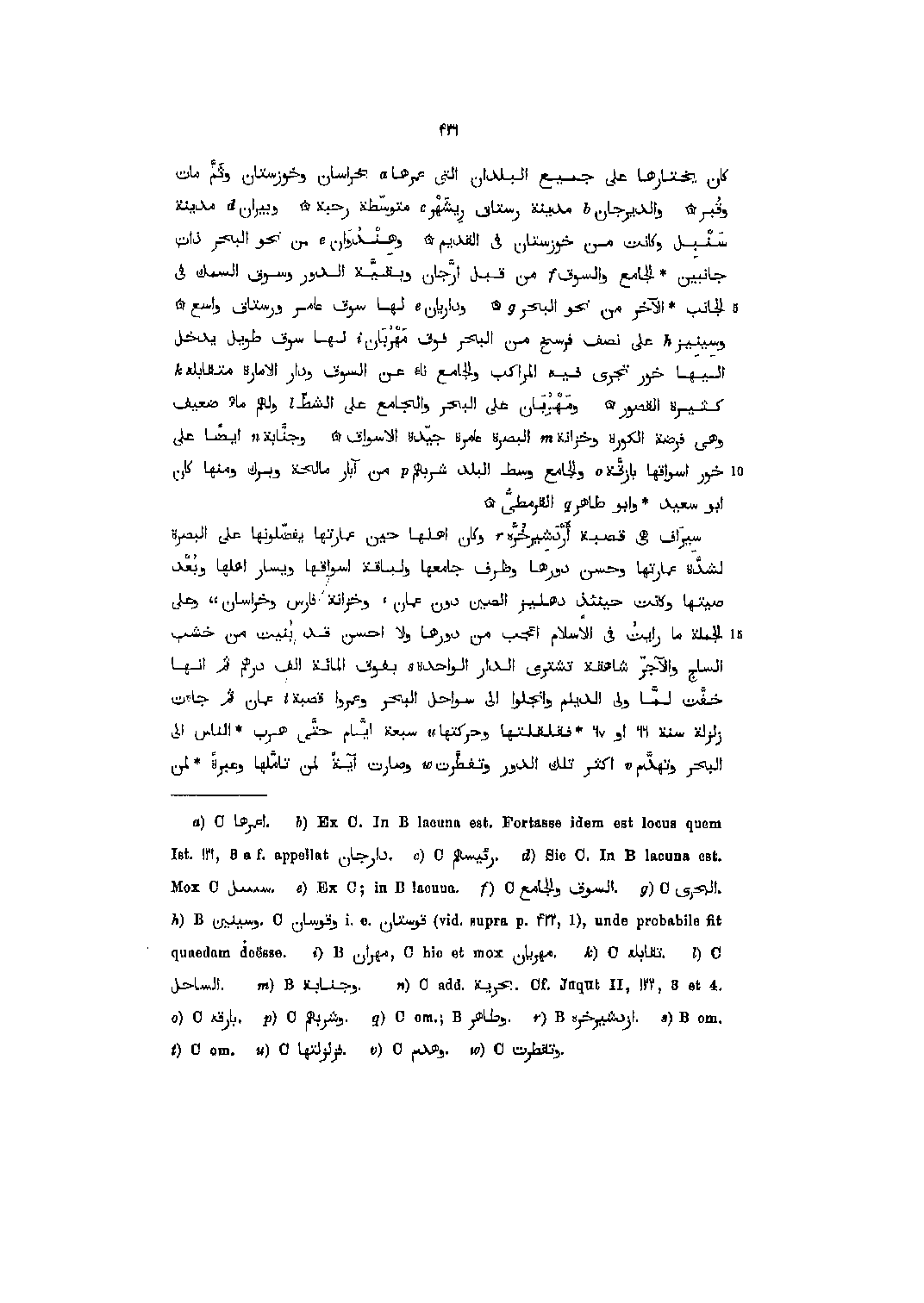 كان يختارها على جميع البلدان التي عمرها [1] بخراسان وخوزستان وثمّ مات وقبر والديرجان [2] مدينة رستاق ريشهر [3] متوسّطة رحبة وبيران [4] مدينة سنبل وكانت من خوزستان في القديم وهندوان [5] من نحو البحر ذات جانبين الجامع والسوق [6] من قبل ارّجان وبقيّة الدور وسوق السمك في الجانب الآخر من نحو البحر [7] وداريان [5] لها سوق عامر ورستاق واسع وسينيز [8] على نصف فرسخ من البحر فوق مهربان [9] لها سوق طويل يدخل اليها خور تجرى فيه المراكب والجامع ناء عن السوق ودار الامارة متقابلة [10] كثيرة القصور ومهربان على البحر والجامع على الشطّ [11] ولهم ماء ضعيف وهي فرضة الكورة وخزانة [12] البصرة عامرة جيّدة الأسواق وجنّابة [13] أيضا على خور أسواقها بازقّة [14] والجامع وسط البلد شربهم [15] من آبار مالحة وبرك ومنها كان ابو سعيد وابو طاهر [16] القرمطيّ سيراف هي قصبة أردشيرخرّه [17] وكان أهلها حين عمارتها يفضّلونها على البصرة لشدّة عمارتها وحسن دورها وظرف جامعها ولباقة أسواقها ويسار أهلها وبعد صيتها وكانت حينئذ دهليز الصين دون عمان، وخزانة فارس وخراسان،، وعلى الجملة ما رأيت في الإسلام اعجب من دورها ولا أحسن قد بنيت من خشب السلج والآجرّ شاهقة تشترى الدار الواحدة [18] بفوق المائة ألف درهم ثم انها خفّت لمّا ولى الديلم وانجلوا الى سواحل البحر وعمروا قصبة [19] عمان ثم جاءت زلزلة سنة 66 أو 67 فقلقلتها وحركتها [20] سبعة أيّام حتّى هرب الناس الى البحر وتهدّم [21] أكثر تلك الدور وتفطّرت [22] وصارت آية لمن تأمّلها وعبرة لمن
