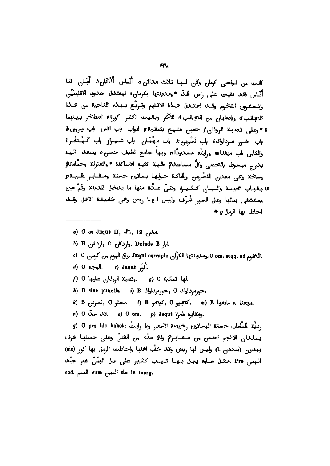[16] رديّة الحمّامات حسنة البساتين رخيصة الأسعار وما رأيت Cprohishabet:ببلدان الأعاجم أحسن من مقابرهم ولهم عدّة من القنيّ وعلى حصنها شرف يمدون (يمددن (l.وليس لها ربض وقد خفّ أهلها وأحاطت الرمال بها كور (sic) البمي.Pro مثل ساوة يعمل بها ثياب كثير على عمل البمّيّ غير جيّد inmarg.عله [؟] المنLJcum [؟] را [?] الم cod. [؟]