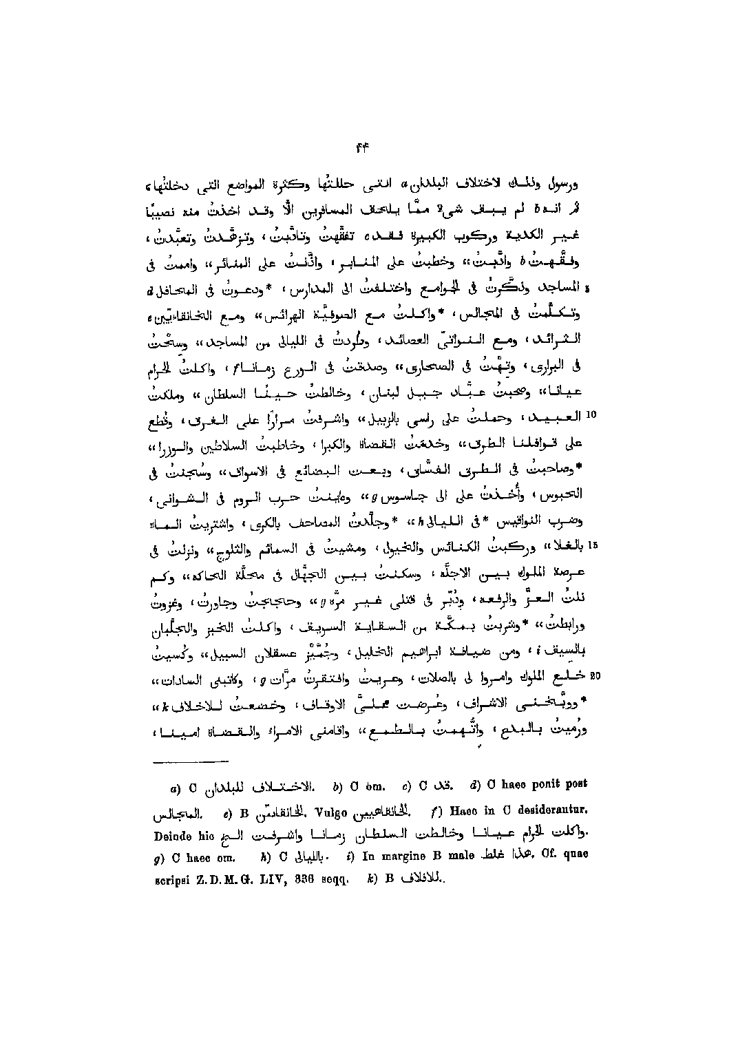 ورسول وذلك لاختلاف البلدان [1] التي حللتها وكثرة المواضع التي دخلتها، ثم انه [2] لم يبق شيء ممّا يلحق المسافرين الّا وقد أخذت منه نصيبا غير الكدية وركوب الكبيرة فقد [3] تفقّهت وتأدّبت، وتزهّدت وتعبّدت، وفقّهت [2] وادّبت،، وخطبت على المنابر، واذّنت على المنائر،، واممت في 5 المساجد وذكّرت في الجوامع واختلفت الى المدارس، ودعوت في المحافل [4] وتكلّمت في المجالس، واكلت مع الصوفيّة الهرائس،، ومع الخانقائيّين [5] الثرائد، ومع النواتىّ العصائد، وطردت في الليالي من المساجد،، وسحت في البراري، وتهت في الصحاري،، وصدقت في الورع زمانا [6] ، واكلت الحرام عيانا،، وصحبت عبّاد جبل لبنان، وخالطت حينا السلطان،، وملكت 10 العبيد، وحملت على راسى بالزبيل،، وأشرفت مرارا على الغرق، وقطع على قوافلنا الطرق،، وخدمت القضاة والكبرا، وخاطبت السلاطين والوزراء،، وصاحبت في الطرق الفسّاق، وبعت البضائع في الأسواق،، وسجنت في الحبوس، وأخذت على انى جاسوس [7] ،، وعاينت حرب الروم في الشواني، وضرب النواقيس في الليالي [8] ،، وجلّدت المصاحف بالكرى، واشتريت الماء 15 بالغلاء،، وركبت الكنائس والخيول، ومشيت في السمائم والثلوج،، ونزلت في عرصة الملوك بين الاجلّة، وسكنت بين الجهّال في محلّة الحاكة،، وكم نلت العزّ والرفعة، ودبّر في قتلى غير مرّة [7] ،، وحججت وجاورت، وغزوت ورابطت،، وشربت بمكّة من السقاية السويق، واكلت الخبز والجلّبان بالسيق [9] ، ومن ضيافة إبراهيم الخليل، وجمّيز عسقلان السبيل،، وكسيت 20 خلع الملوك وأمروا لي بالصلات، وعريت وافتقرت مرّات [7] ، وكاتبني السادات،، ووبّخنى الاشراف، وعرضت عليّ الأوقاف، وخضعت للاخلاف [10] ،، ورميت بالبدع، واتّهمت بالطمع،، وأقامني الأمراء والقضاة أمينا،