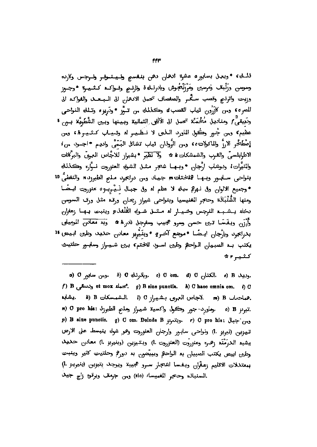 ذلك، ويعمل بسابور [1] عشرة ادهان دهن بنفسج ونينوفر ونرجس وكارده وسوسن وزنبق ومرسين ومرزنجوش وبادرنك [2] ونارنج وفواكه كثيرة وجوز وزيت واترنج وقصب سكّر والصفصاف تحمل الادهان الى البعد والفواكه الى المصر [3] ، ومن كازرون ثياب القصب [4] وكذلك من توّز ودريز [5] وتلك النواحي ودبيقيّ [6] ومناديل مخمة تحمل الى الآفاق الثمانية وبينها وبين الشّطويّة بون عظيم، ومن جور وكول الماورد الّذي لا نظير له وثياب كثير [7] ، ومن إصطخر الارزّ والمأكولات [8] ، ومن الرّوذان ثياب تشاكل البمّيّ واديم أجود من [9] الاطرابلسىّ والقرب والشمشكات [10] ولا نظير بشيراز للاجّاص العمرىّ والبرّكانات والمنيّرات [11] ودوشاب ارّجان وبها شجر مثل الشوك العنزروت نوّاره وكذلك بنواحي سابور وبها هملختات [12] جياد ومن درابجرد ملح الطبرزد [13] والنفطىّ وجميع الألوان وفي نهرهم سمك لا عظم له وفي جبال نيريز [14] عنزروت أيضا ومنها الشّنباذة وحجر المغنيسيا وبنواحي شيراز ريحان ورقه مثل ورق السوسن دخله يشبه النرجس وخيار له مثل شوك القنفذ [15] وينبت بها زعفران وأرزن وبفساتين حسن وسرو عجيب وسفرجل نادر [8] وبه معادن المومياى بدارابجرد وبأرّجان أيضا موضع آخر [16] وبنيريز معادن حديد وطين ابيض يكتب به الصبيان ألواحهم وطين اسود للختم، بين شيراز وسابور حلتيث كثير [17]