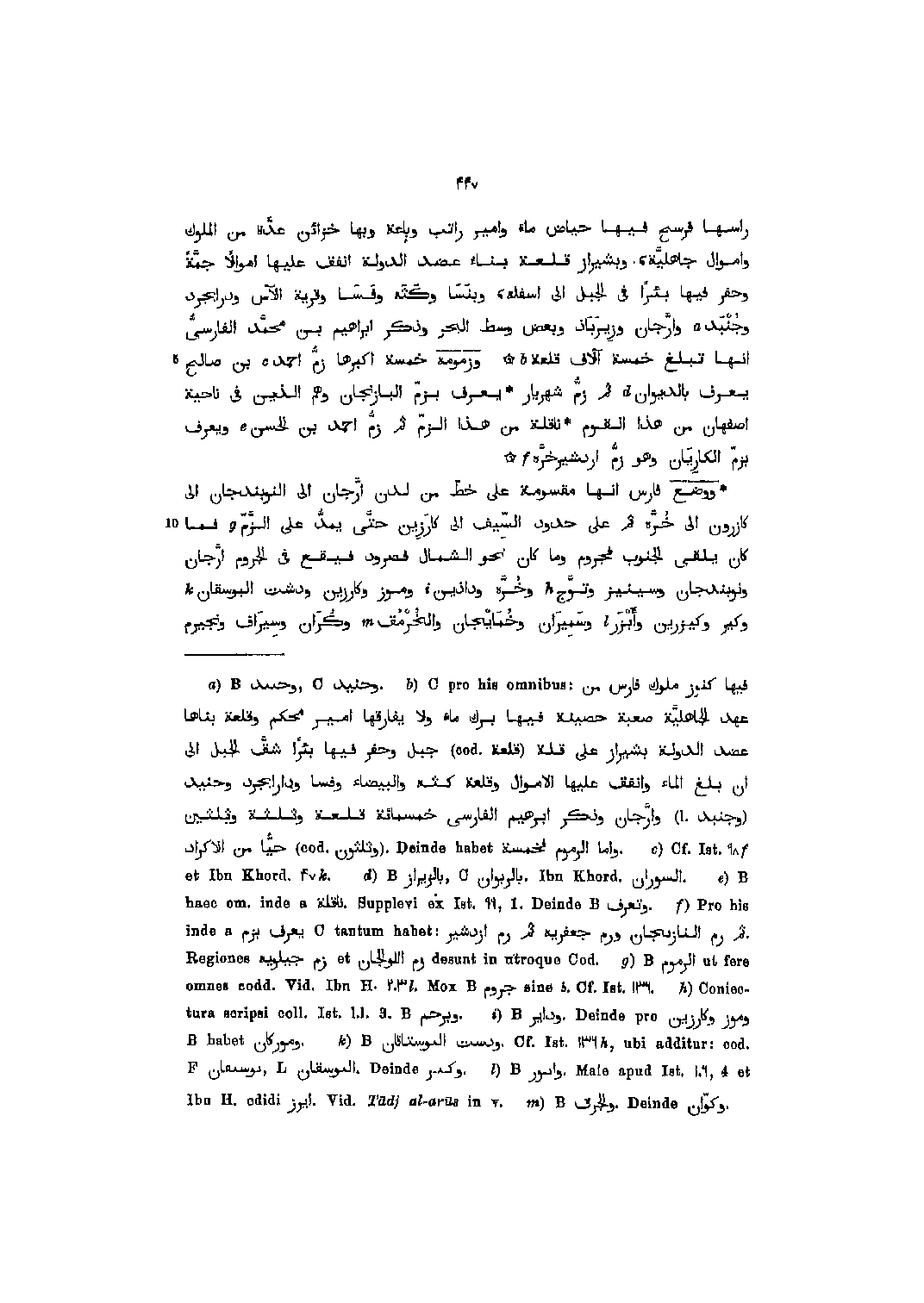 [2] فيها كنوز ملوك فارس من Cprohisomnibus:عهد الجاهليّة صعبة حصينة فيها برك ماء ولا يفارقها أمير محكم وقلعة بناها عضد الدولة بشيراز على قلة (قلعة cod.جبل وحفر فيها بئرا شقّ الجبل الى ان بلغ الماء وأنفق عليها الأموال وقلعة كثة والبيضاء وفسا ودارابجرد وحنيد (وجنبد (l.وارّجان وذكر إبراهيم الفارسي خمسمائة قلعة وثلاثة وثلاثين. واما الروم فخمسة) .Deindehabet وثلاثون (cod.حيّا من الأكراد