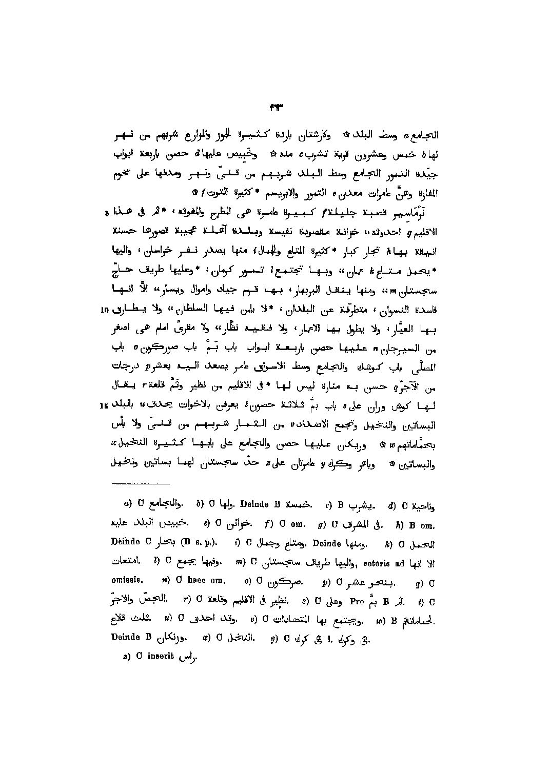 الجامع [1] وسط البلد وكارشتان باردة كثيرة الجوز والمزارع شربهم من نهر لها [2] خمس وعشرون قرية تشرب [3] منه وخبيص عليها [4] حصن بأربعة أبواب جيّدة التمور الجامع وسط البلد شربهم من قنىّ ونهر ومدنها على تخوم المفازة وهنّ عامرات معدن [5] التمور والإبريسم كثيرة التوت [6] نرماسير قصبة جليلة [6] كبيرة عامرة هي المطرح والمغوثه، ثم في هذا الإقليم [7] أحدوثة،، خزانة مقصودة نفيسة وبلدة آهلة عجيبة قصورها حسنة انيقة بها [8] تجار كبار كثيرة المتاع والجمال [9] منها يصدر نفر خراسان، واليها يحمل متاع [10] عمان،، وبها تجتمع [11] تمور كرمان، وعليها طريق حاجّ سجستان [12] ،، ومنها ينقل البربهار، بها قوم جياد واموال ويسار،، الّا انها فاسدة النسوان، متطرّفة عن البلدان، لا يأمن فيها السلطان،، ولا يطارق بها العيّار، ولا يطول بها الأعمار، ولا فقيه نظّار،، ولا مقرئ امام هي أصغر من السيرجان [13] عليها حصن بأربعة أبواب باب بمّ باب صوركون [14] باب المصلّى باب كوشك والجامع وسط الأسواق عامر يصعد اليه بعشر [15] درجات من الآجر [16] حسن به منارة ليس لها في الإقليم من نظير وثمّ قلعة [17] يقال لها كوش وران على [18] باب بمّ ثلاثة حصون [19] يعرفن بالاخوات يحدق [20] بالبلد البساتين والنخيل وتجمع الاضداد [21] من الثمار شربهم من قنىّ ولا بأس بحمّاماتهم [22] وريكان عليها حصن والجامع على بابها كثيرة النخيل [23] والبساتين وباهر وكرك [24] عامرتان على [25] حدّ سجستان لهما بساتين ونخيل