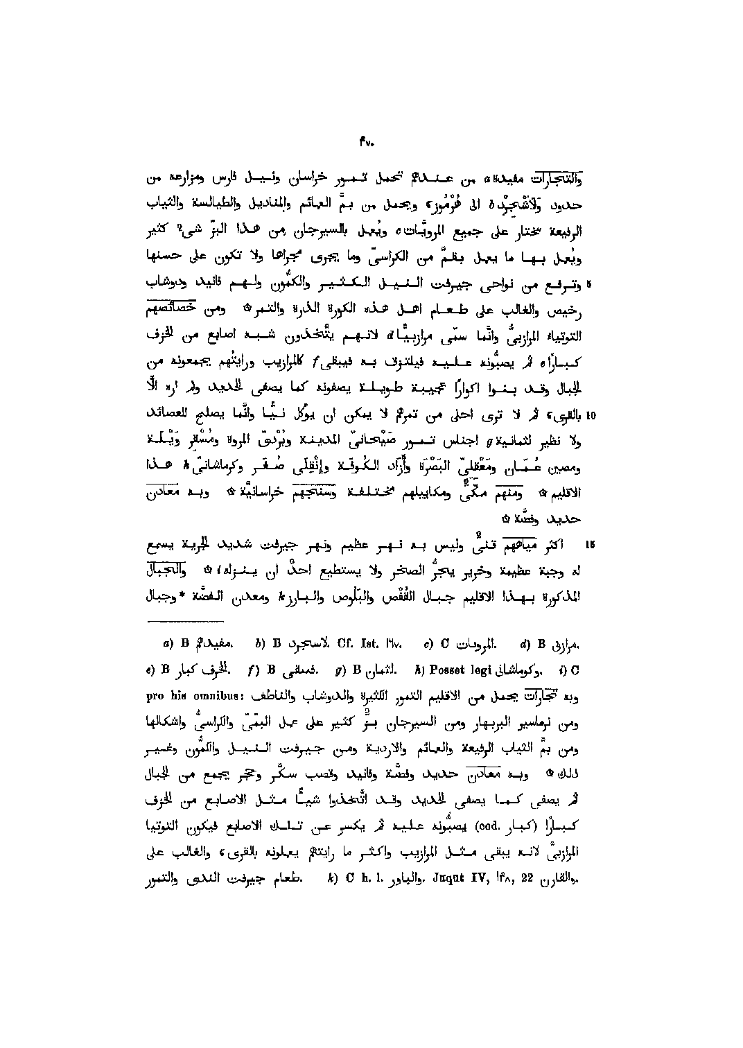 C [9] وبه تجارات يحمل من الإقليم التمور الكثيرة والدوشاب والناطف prohisomnibus:ومن نرماسير البربهار ومن السيرجان بزّ كثير على عمل البمّيّ والكراسيّ وأشكالها ومن بمّ الثياب الرفيعة والعمائم والاردية ومن جيرفت النيل والكمّون وغير ذلك وبه معادن حديد وفضّة وفانيد وقصب سكّر وحجر يجمع من الجبال ثم يصفي كما يصفي الحديد وقد اتّخذوا شيئا مثل الأصابع من الخزف كبارا (كبار (cod.يصبّونه عليه ثم يكسر عن تلك الأصابع فيكون التوتيا المرازبىّ لانه يبقى مثل المرازيب وأكثر ما رايتهم يعملونه بالقرى، والغالب على. طعام جيرفت الندى والتمور