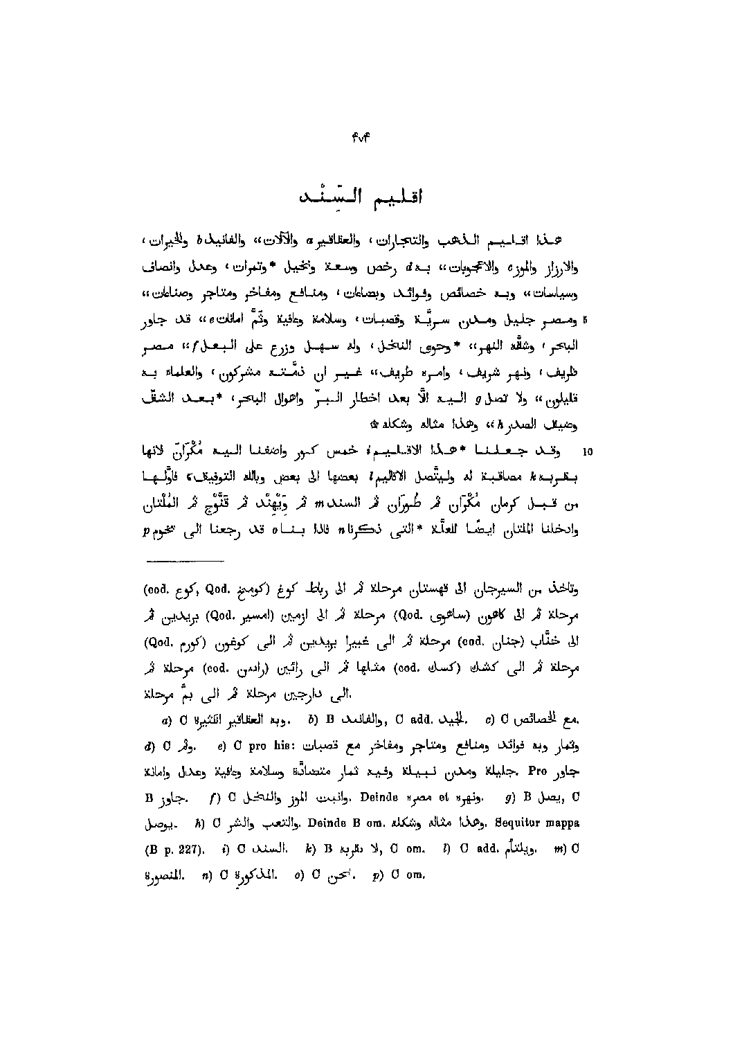 هذا إقليم الذهب والتجارات، والعقاقير [1] والآلات، والفانيذ [2] والخيرات، والارزاز والموز [3] والاعجوبات،، به [4] رخص وسعة ونخيل وتمرات، وعدل وانصاف وسياسات،، وبه خصائص وفوائد وبضاعات، ومنافع ومفاخر ومتاجر وصناعات،، ومصر جليل ومدن سريّة وقصبات، وسلامة وعافية وثمّ أمانات [5] ،، قد جاور البحر، وشقّه النهر،، وحوى النخل، وله سهل وزرع على البعل [6] ،، مصر ظريف، ونهر شريف، وامره طريف،، غير ان ذمّته مشركون، والعلماء به قليلون،، ولا تصل [7] اليه الّا بعد اخطار البرّ وأهوال البحر، بعد الشقّ وضيق الصدر [8] ،، وهذا مثاله وشكله وقد جعلنا هذا الإقليم [9] خمس كور وأضفنا اليه مكران لأنها بقربة [10] مصاقبة له وليتّصل الأقاليم [11] بعضها الى بعض وباللَّه التوفيق، فاوّلها من قبل كرمان مكران ثم طوران ثم السند [12] ثم ويهند ثم قنّوج ثم الملتان وادخلنا الملتان أيضا للعلّة التي ذكرنا [13] فإذا بنا [14] قد رجعنا الى تخوم [15]