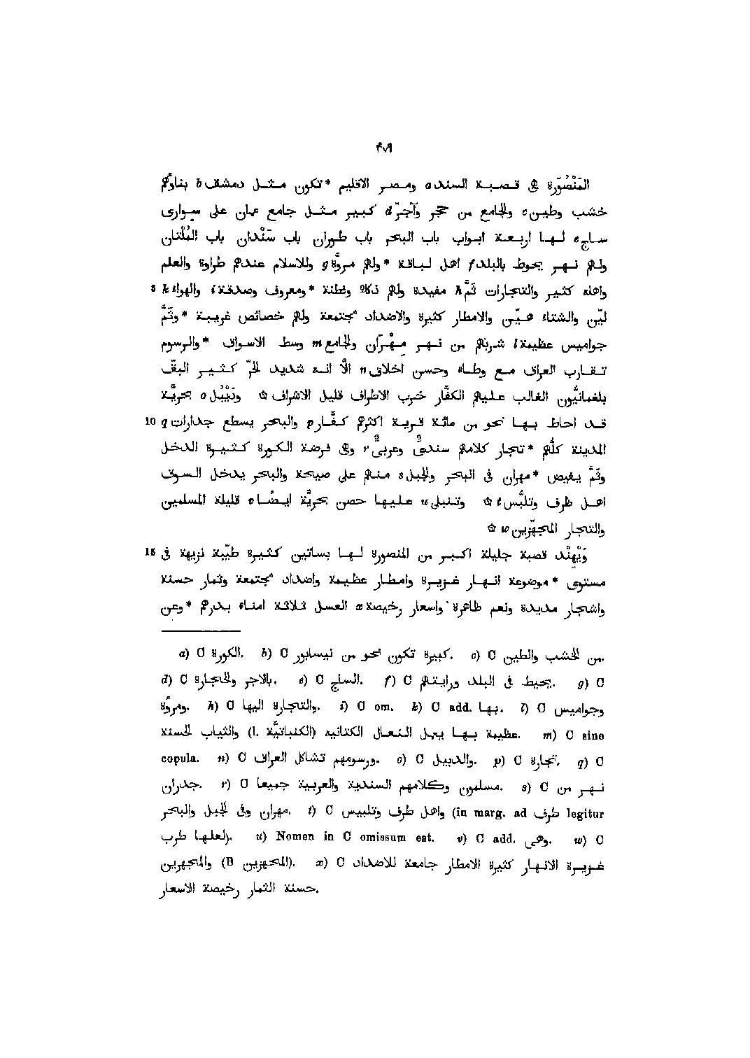المنصورة هي قصبة السند [1] ومصر الإقليم تكون مثل دمشق [2] بناؤهم خشب وطين [3] والجامع من حجر وآجرّ [4] كبير مثل جامع عمان على سواري ساج [5] لها اربعة أبواب باب البحر باب طوران باب سندان باب الملتان ولهم نهر يحوط بالبلد [6] أهل لباقة ولهم مروّة [7] وللإسلام عندهم طراوة والعلم واهله كثير والتجارات ثمّ [8] مفيدة ولهم ذكاء وفطنة ومعروف وصدقة [9] والهواء [10] ليّن والشتاء هيّن والامطار كثيرة والاضداد مجتمعة ولهم خصائص غريبة وثمّ جواميس عظيمة [11] شربهم من نهر مهران والجامع [12] وسط الأسواق والرسوم تقارب العراق مع وطاء وحسن أخلاق [13] الّا انه شديد الحرّ كثير البقّ بلغمانيّون الغالب عليهم الكفّار خرب الاطراف قليل الاشراف وديبل [14] بحريّة قد أحاط بها نحو من مائة قرية أكثرهم كفّار [15] والبحر يسطع جدارات [16] المدينة كلّهم تجار كلامهم سنديّ وعربىّ [17] وهي فرضة الكورة كثيرة الدخل وثمّ يفيض مهران في البحر والجبل [18] منهم على صيحة والبحر يدخل السوق أهل ظرف وتلبّس [19] وتنبلى [20] عليها حصن بحريّة أيضا [21] قليلة المسلمين والتجار المجهّزين [22] ويهند قصبة جليلة أكبر من المنصورة لها بساتين كثيرة طيّبة نزيهة في مستوى موضوعة انهار غزيرة وامطار عظيمة وأضداد مجتمعة وثمار حسنة وأشجار مديدة ونعم ظاهرة واسعار رخيصة [23] العسل ثلاثة أمناء بدرهم وعن