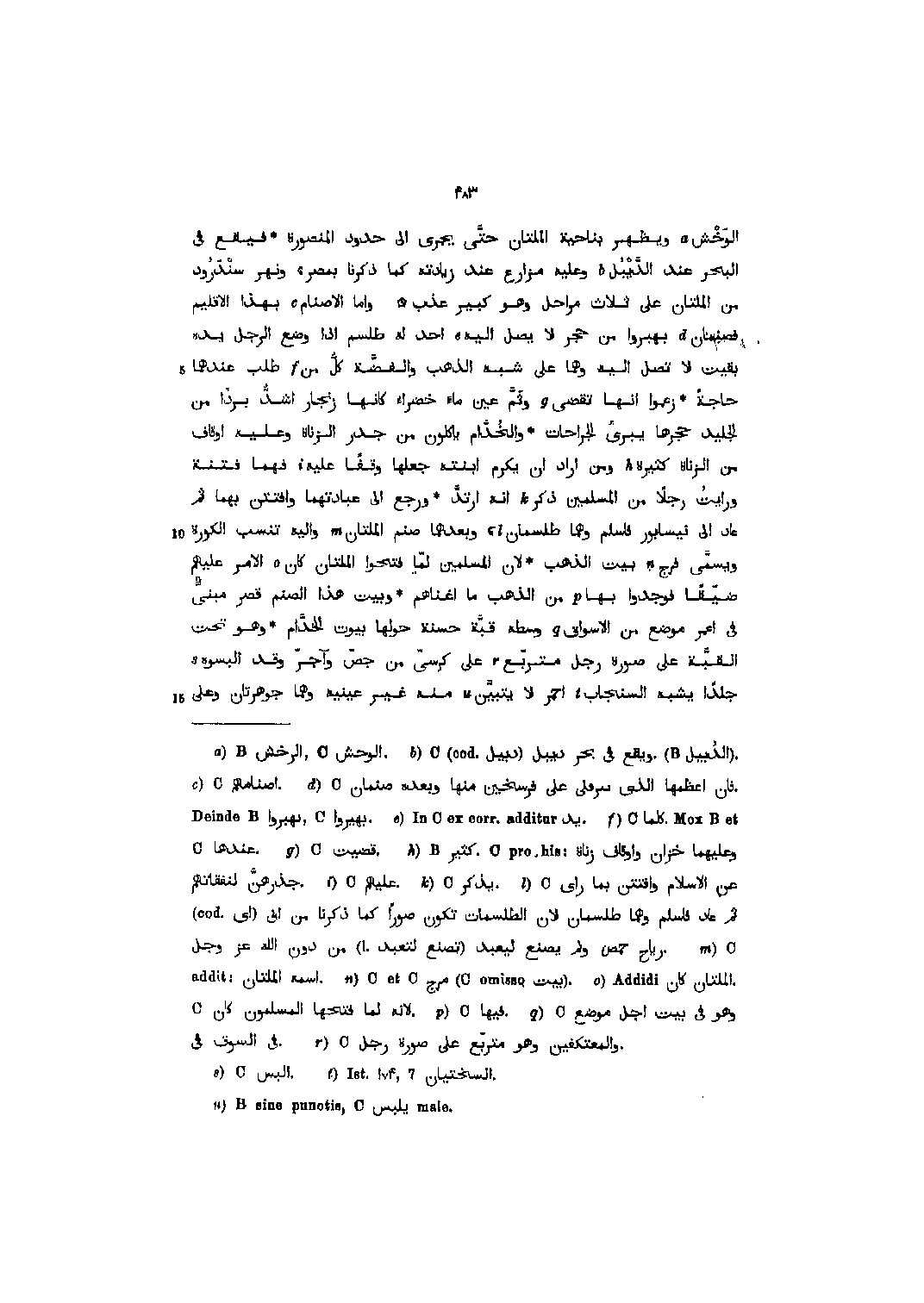 الوخش [1] ويظهر بناحية الملتان حتّى يجرى الى حدود المنصورة فيقع في البحر عند الدّيبل [2] وعليه مزارع عند زيادته كما ذكرنا بمصر، ونهر سندرود من الملتان على ثلاث مراحل وهو كبير عذب واما الأصنام [3] بهذا الإقليم فصنمان [4] بهبروا من حجر لا يصل اليه [5] أحد له طلسم إذا وضع الرجل يده بقيت لا تصل اليه وهما على شبه الذهب والفضّة كلّ من [6] طلب عندهما حاجة زعموا انها تقضى [7] وثمّ عين ماء خضراء كأنها زنجار اشدّ بردا من الجليد حجرها يبرئ الجراحات والخدّام يأكلون من جدر الزناة وعليه أوقاف من الزناة كثيرة [8] ومن أراد ان يكرم ابنته جعلها وقفا عليه [9] فهما فتنة ورأيت رجلا من المسلمين ذكر [10] انه ارتدّ ورجع الى عبادتهما وافتتن بهما ثم عاد الى نيسابور فأسلم وهما طلسمان [11] ، وبعدهما صنم الملتان [12] واليه تنسب الكورة ويسمّى فرج [13] بيت الذهب لان المسلمين لمّا فتحوا الملتان كان [14] الأمر عليهم ضيّقا فوجدوا بها [15] من الذهب ما أغناهم وبيت هذا الصنم قصر مبنيّ في اعمر موضع من الأسواق [16] وسطه قبّة حسنة حولها بيوت الخدّام وهو تحت القبّة على صورة رجل متربّع [17] على كرسيّ من جصّ وآجرّ وقد ألبسوه [18] جلدا يشبه السنجاب [19] احمر لا يتبيّن [20] منه غير عينيه وهما جوهرتان وعلى