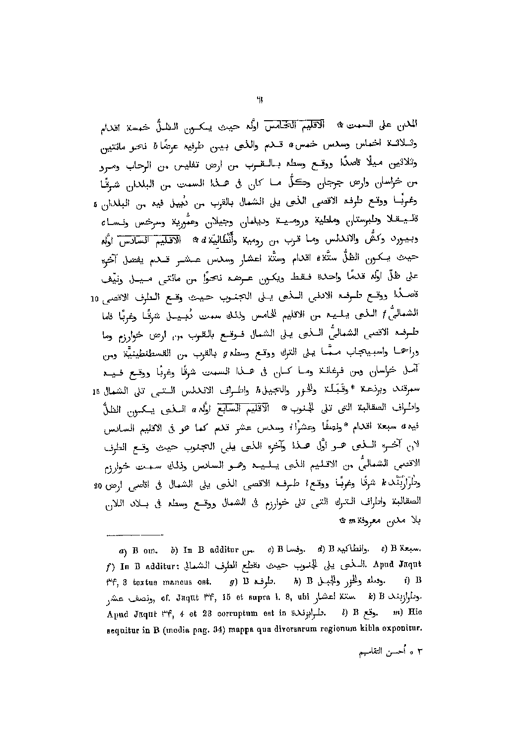 أوّله حيث يكون الظلّ ستّة [5] أقدام وستّة أعشار وسدس عشر قدم يفضل آخره على ظلّ أوّله قدما واحدة فقط ويكون عرضه نحوا من مائتي ميل ونيّف قاصدا ووقع طرفه الأدنى الّذي يلي الجنوب حيث وقع الطرف الأقصى 10 الشمالىّ [6] الّذي يليه من الإقليم الخامس وذلك سمت دبيل شرقا وغربا فاما طرفه الأقصى الشمالىّ الّذي يلي الشمال فوقع بالقرب من ارض خوارزم وما وراءها وأسبيجاب ممّا يلي الترك ووقع وسطه [7] بالقرب من القسطنطينيّة ومن آمل خراسان ومن فرغانة وما كان في هذا السمت شرقا وغربا ووقع فيه سمرقند وبرذعة وقبلة والخزر والجيل [8] واطراف الأندلس التي تلى الشمال 15 واطراف الصقالبة التي تلى الجنوب