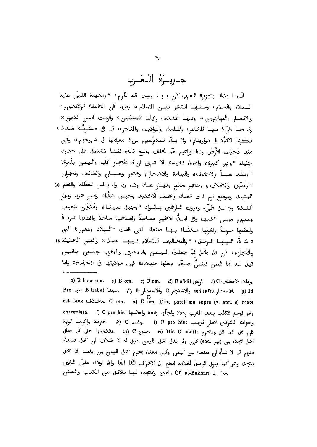 انّما بدأنا بجزيرة العرب لان بها بيت الله الحرام، [1] ومدينة النبيّ عليه الصلاة والسلام، ومنها انتشر دين الإسلام،، وفيها كان الخلفاء الراشدون، والأنصار والمهاجرون،، وبها عقدت رايات المسلمين، وقويت أمور الدين،، وأيضا فانّ [2] بها المشاعر، والمناسك والمواقيت والمناحر،، ثم هي عشريّة قد [2] 5 ذكرها الائمّة في دواوينهم، ولا بدّ للمدرّسين من [2] معرفتها في شروحهم،، ولان منها دحيت الأرض ودعا إبراهيم عم الخلق ومع ذلك فإنها تشتمل على حدود جليلة وكور كبيرة [3] واعمال نفيسة الا ترى ان [4] الحجاز كلّها واليمن بأسرها وبلد سبإ والأحقاف [5] واليمامة والاشحار [6] وهجر وعمان والطائف ونجران وحنّين والمخلاف [7] وحجر صالح وديار عاد وثمود والبئر المعطّلة والقصر 10 المشيد وموضع ارم ذات العماد وأصحاب الأخدود وحبس شدّاد وقبر هود وديار كندة وجبل طيِّئ وبيوت الفارهين بالواد وجبل سينا [8] ومدين شعيب وعيون موسى فيها وهي امدّ الأقاليم مساحة وأفسحها ساحة وأفضلها تربة وأعظمها حرمة وأشرفها مدنا [9] بها صنعاء التي فاقت البلاد وعدن [10] التي تشدّ اليها الرحال، والمخاليف للإسلام فيها جمال،، واليمن الجليلة 15 والحجاز [11] ، فان قال قائل لم جعلت اليمن والمشرق والمغرب جانبين جانبين قيل له اما اليمن فالنبيّ صلى الله عليه وسلم جعلها حيث [12] فرق مواقيتها في الإحرام [13] ، واما