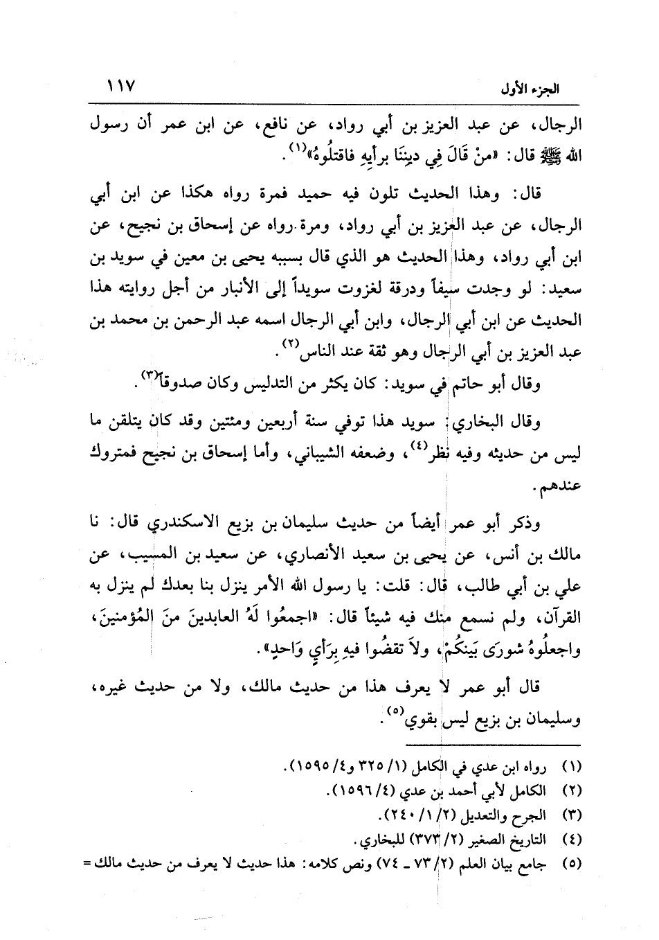 الرجال، عن عبد العزيز بن أبي رواد، عن نافع، عن ابن عمر أن رسول الله - صلى الله عليه وسلم - قال: "منْ قَالَ فِي دينِنَا برأيِهِ فاقتلُوهُ" (¬1).