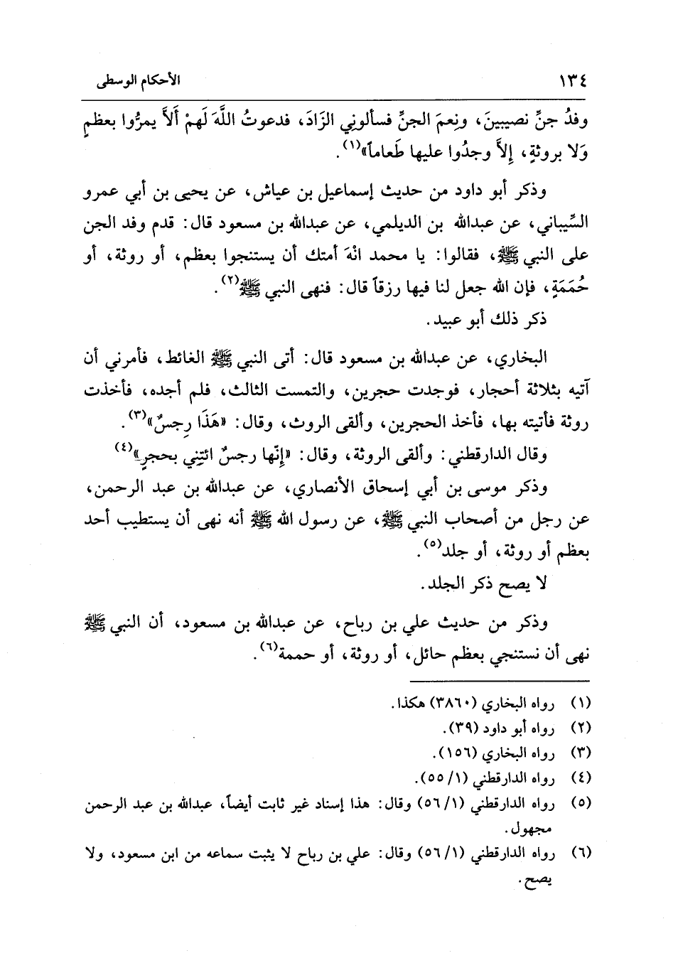 البخاري، عن عبد الله بن مسعود قال: أتى النبي - صلى الله عليه وسلم - الغائط، فأمرني أن آتيه بثلاثة أحجار، فوجدت حجرين، والتمست الثالث، فلم أجده، فأخذت روثة فأتيته بها، فأخذ الحجرين، وألقى الروث، وقال: "هَذَا رِجسٌ" (¬3).