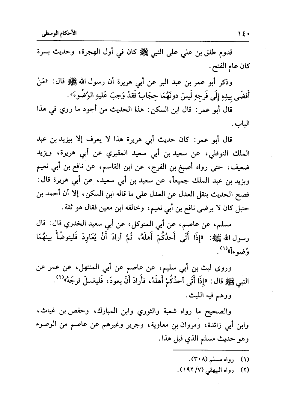 وذكر أبو عمر بن عبد البر عن أبي هريرة أن رسول الله - صلى الله عليه وسلم - قال: "مَنْ أَفضَى بِيدِهِ إِلَى فَرجِهِ لَيسَ دونَهُمَا حِجَابٌ فَقدْ وَجبَ عَليهِ الوُضُوءَ".