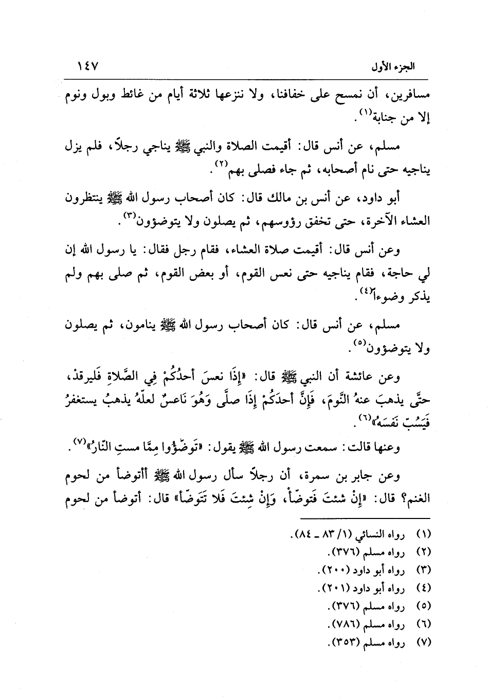 مسلم، عن أنس قال: كان أصحاب رسول الله - صلى الله عليه وسلم - ينامون، ثم يصلون ولا يتوضؤون (¬5).