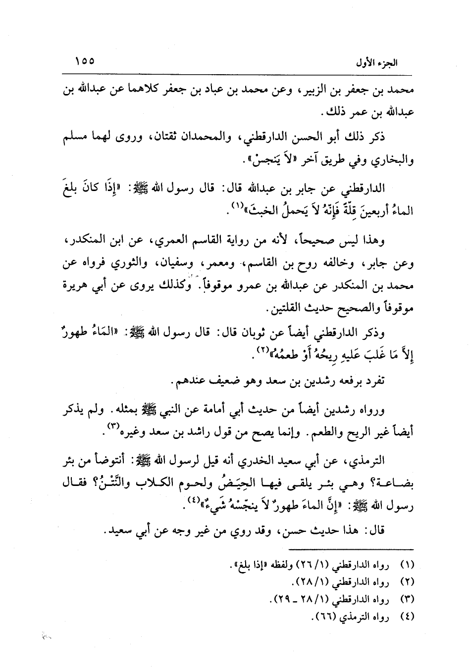 الدارقطني عن جابر بن عبد الله قال: قال رسول الله - صلى الله عليه وسلم -: "إِذا كانَ بلغَ الماءُ أربعينَ قلّةً فَإنّهُ لاَ يَحملُ الخبثَ" (¬1).