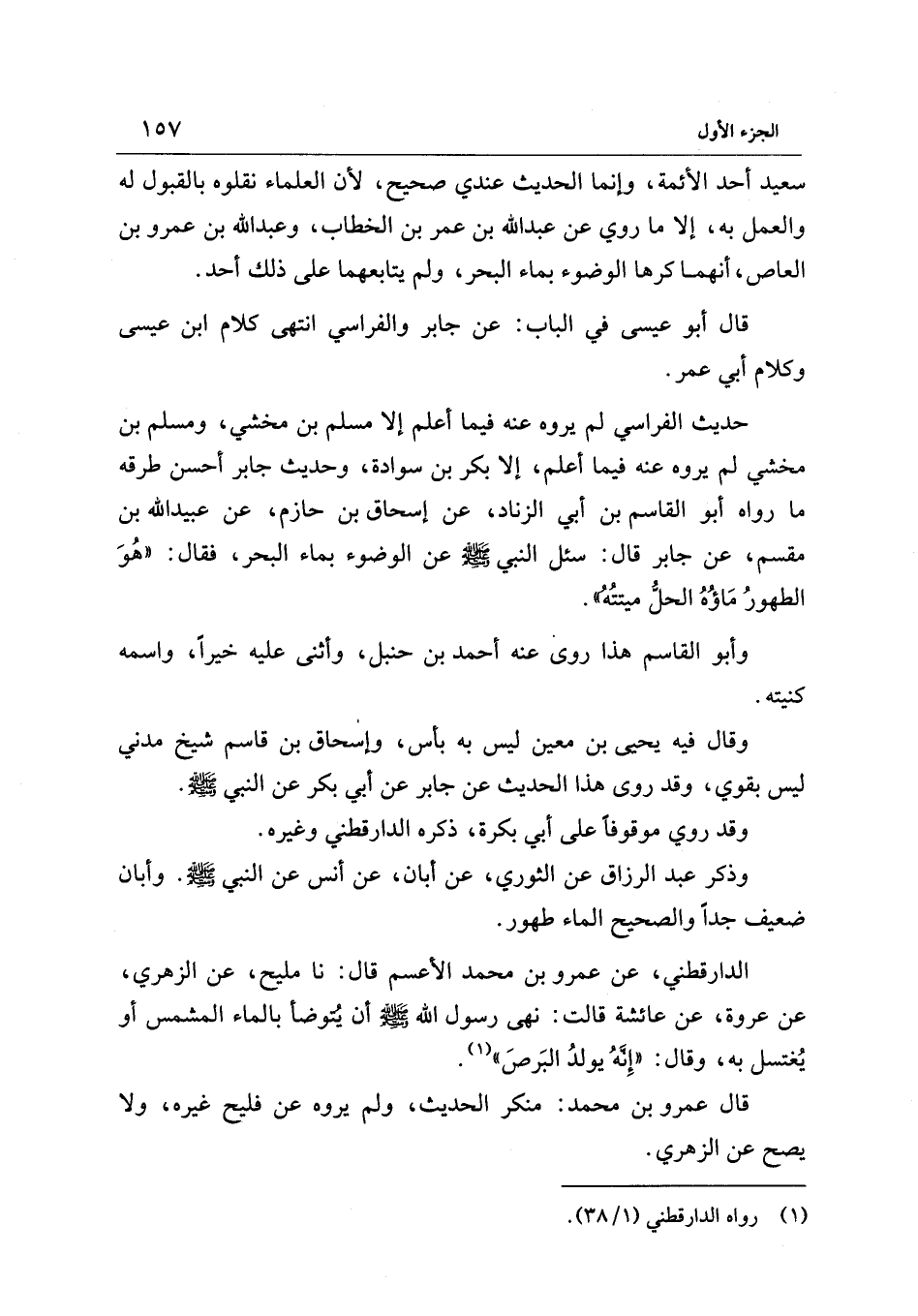 حديث الفراسي لم يروه عنه فيما أعلم إلا مسلم بن مخشي، ومسلم بن مخشي لم يروه عنه فيما أعلم، إلا بكر بن سوادة، وحديث جابر أحسن طرقه ما رواه أبو القاسم بن أبي الزناد، عن إسحاق بن حازم، عن عبيد الله بن مقسم، عن جابر قال: سئل النبي - صلى الله عليه وسلم - الوضوء بماء البحر، فقال: "هُوَ الطهورُ ماؤُهُ الحلُّ ميتتُهُ".