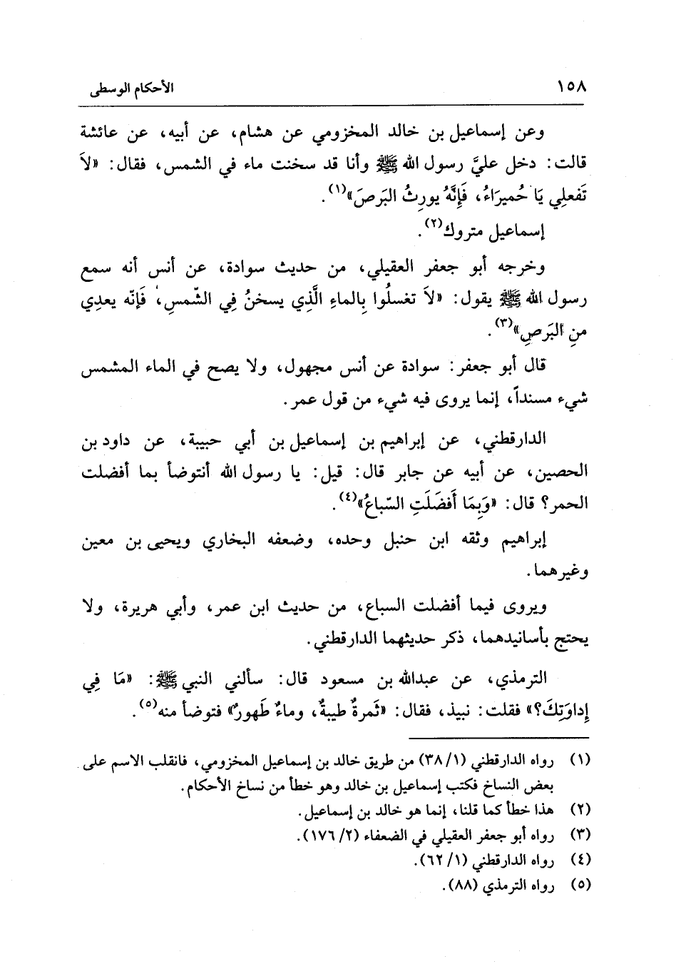 (¬1) رواه الدارقطني (1/ 38) من طريق خالد بن إسماعيل المخزومي، فانقلب الاسم على بعض النساخ فكتب إسماعيل بن خالد وهو خطأ من نساخ الأحكام.
