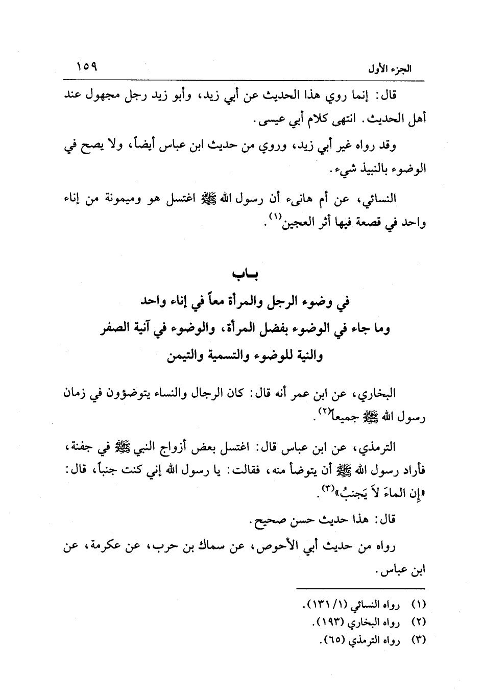 باب في وضوء الرجل والمرأة معًا في إناء واحد وما جاء في الوضوء بفضل المرأة، والوضوء في آنية الصفر والنية للوضوء والتسمية والتيمن