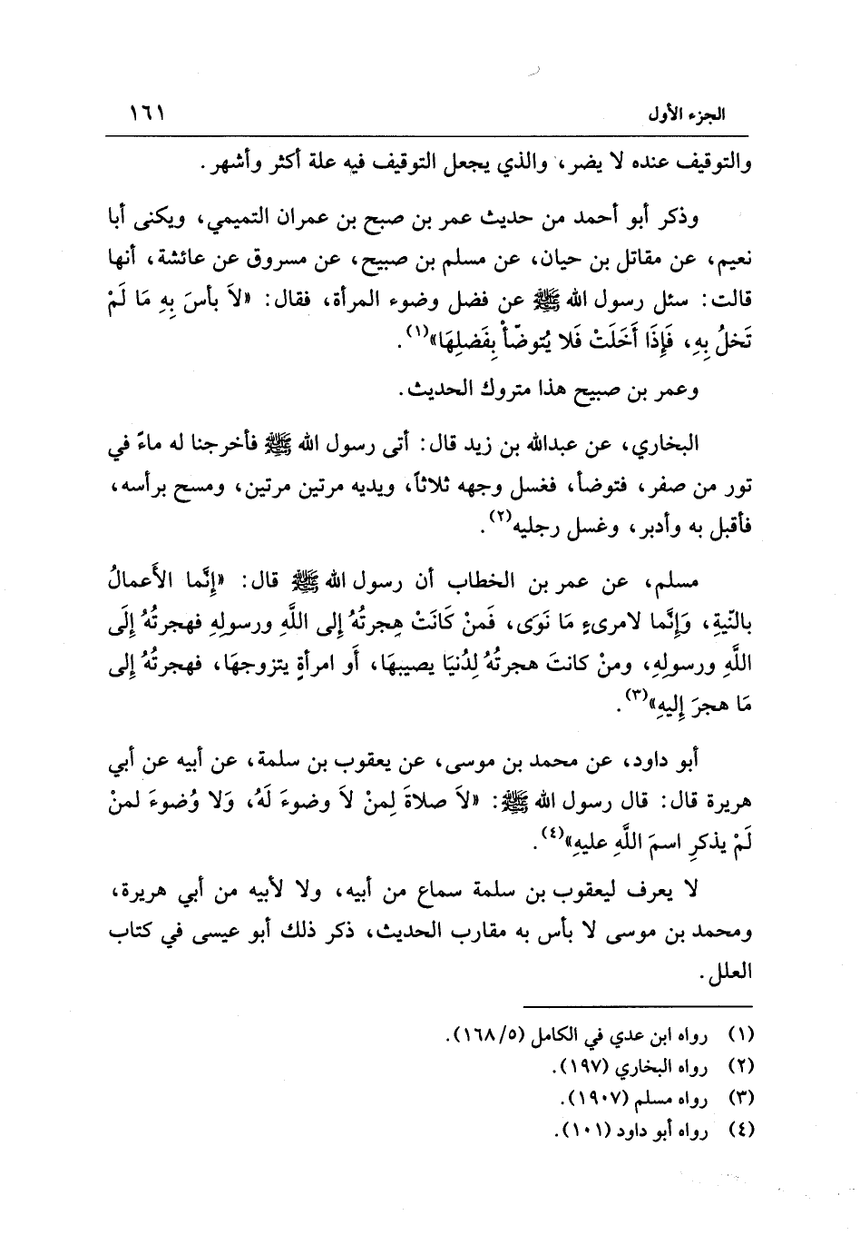 أبو داود، عن محمَّد بن موسى، عن يعقوب بن سلمة، عن أبيه عن أبي هريرة قال: قال رسول الله - صلى الله عليه وسلم -: "لا صلاةَ لِمنْ لا وضوءَ لَهُ، وَلا وُضوءَ لمنْ لَمْ يذكرِ اسمَ الله عليهِ" (¬4).