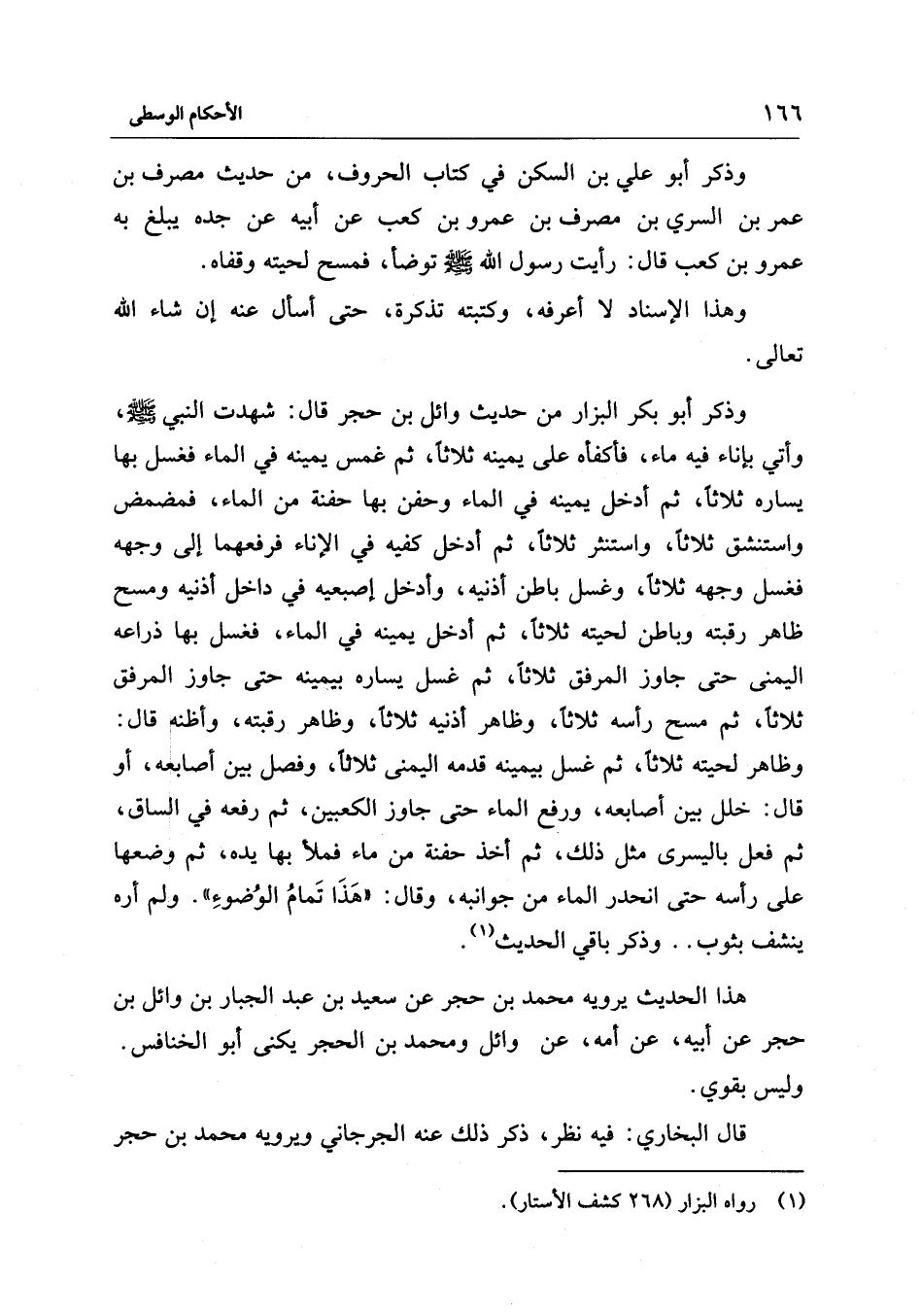 وذكر أبو بكر البزار من حديث وائل بن حجر قال: شهدت النبي - صلى الله عليه وسلم -، وأتي بإناء فيه ماء، فأكفأه على يمينه ثلاثًا، ثمَّ غمس يمينه في الماء فغسل بها يساره ثلاثًا، ثم أدخل يمينه في الماء وحفن بها حفنة من الماء، فمضمض واستنشق ثلاثًا، واستنثر ثلاثًا، ثم أدخل كفيه في الإناء فرفعهما إلى وجهه فغسل وجهه ثلاثًا، وغسل باطن أذنيه، وأدخل إصبعيه في داخل أذنيه ومسح ظاهر رقبته وباطن لحيته ثلاثًا، ثم أدخل يمينه في الماء، فغسل بها ذراعه اليمنى حتى جاوز المرفق ثلاثًا، ثمَّ غسل يساره بيمينه حتى جاوز المرفق ثلاثًا، ثمَّ مسح رأسه ثلاثًا، وظاهر أذنيه ثلاثًا، وظاهر رقبته، وأظنه قال: وظاهر لحيته ثلاثًا، ثمَّ غسل بيمينه قدمه اليمنى ثلاثًا، وفصل بين أصابعه، أو قال: خلل بين أصابعه، ورفع الماء حتى جاوز الكعبين، ثم رفعه في الساق، ثمَّ فعل باليسرى مثل ذلك، ثمَّ أخذ حفنة من ماء فملأ بها يده، ثمَّ وضعها على رأسه حتى انحدر الماء من جوانبه، وقال: "هَذا تَمامُ الوُضوءِ". ولم أره ينشف بثوب. . وذكر باقي الحديث (¬1).