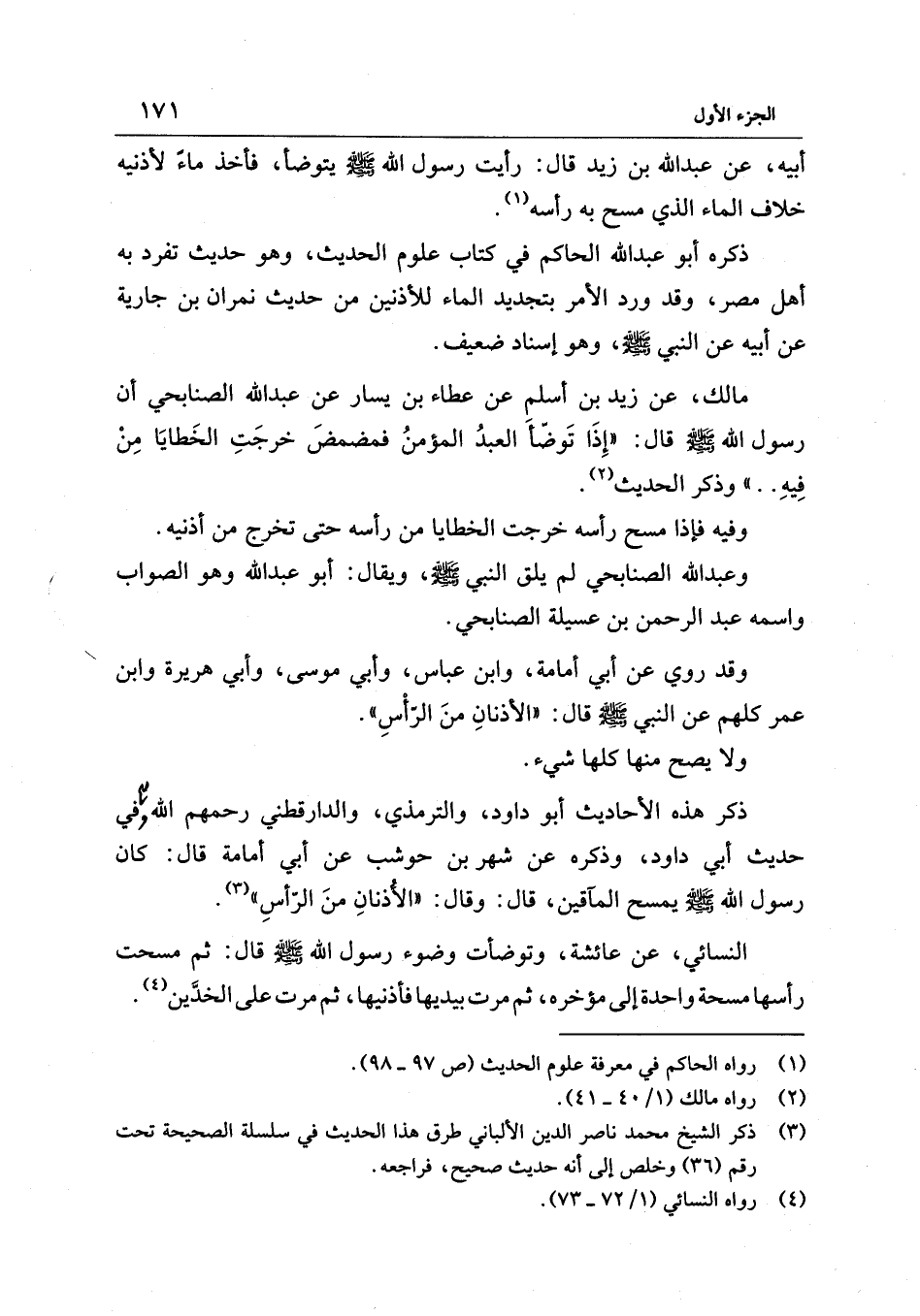 وقد روي عن أبي أمامة، وابن عباس، وأبي موسى، وأبي هريرة وابن عمر كلهم عن النبي - صلى الله عليه وسلم - قال: "الأذنانِ منَ الرّأْسِ".