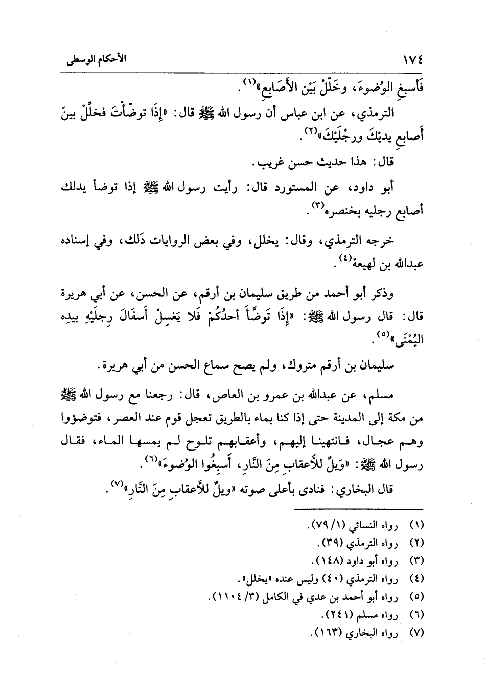 الترمذي، عن ابن عباس أن رسول الله - صلى الله عليه وسلم - قال: "إِذا توضّأْتَ فخلِّلْ بينَ أَصابعِ يديْكَ ورجْلَيْكَ" (¬2).