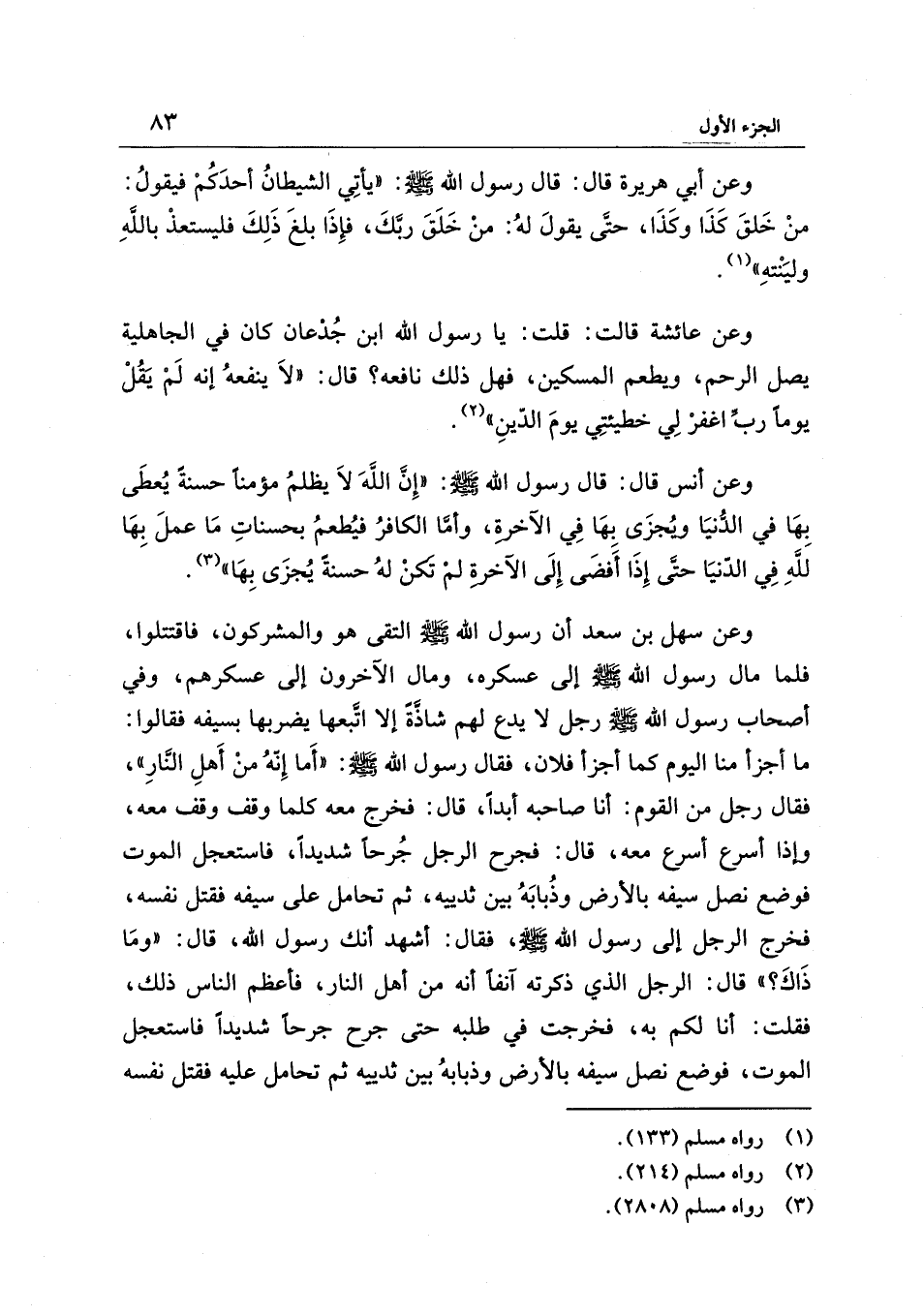 وعن سهل بن سعد أن رسول الله - صلى الله عليه وسلم - التقى هو والمشركون، فاقتتلوا، فلما مال رسول الله - صلى الله عليه وسلم - إلى عسكره، ومال الآخرون إلى عسكرهم، وفي أصحاب رسول الله - صلى الله عليه وسلم - رجل لا يدع لهم شاذَّةً إلا اتَّبعها يضربها بسيفه فقالوا: ما أجزأ منا اليوم كما أجزأ فلان، فقال رسول الله - صلى الله عليه وسلم -: "أَما إِنّهُ منْ أَهلِ النَّارِ"، فقال رجل من القوم: أنا صاحبه أبدًا، قال: فخرج معه كلما وقف وقف معه، وإذا أسرع أسرع معه، قال: فجرح الرجل جُرحًا شديدًا، فاستعجل الموت فوضع نصل سيفه بالأرض وذُبابَهُ بين ثدييه، ثم تحامل على سيفه فقتل نفسه، فخرج الرجل إلى رسول الله - صلى الله عليه وسلم -، فقال: أشهد أنك رسول الله، قال: "ومَا ذَاكَ؟ " قال: الرجل الذي ذكرته آنفًا أنه من أهل النار، فأعظم الناس ذلك، فقلت: أنا لكم به، فخرجت في طلبه حتى جرح جرحًا شديدًا فاستعجل الموت، فوضع نصل سيفه بالأرض وذبابهُ بين ثدييه ثم تحامل عليه فقتل نفسه