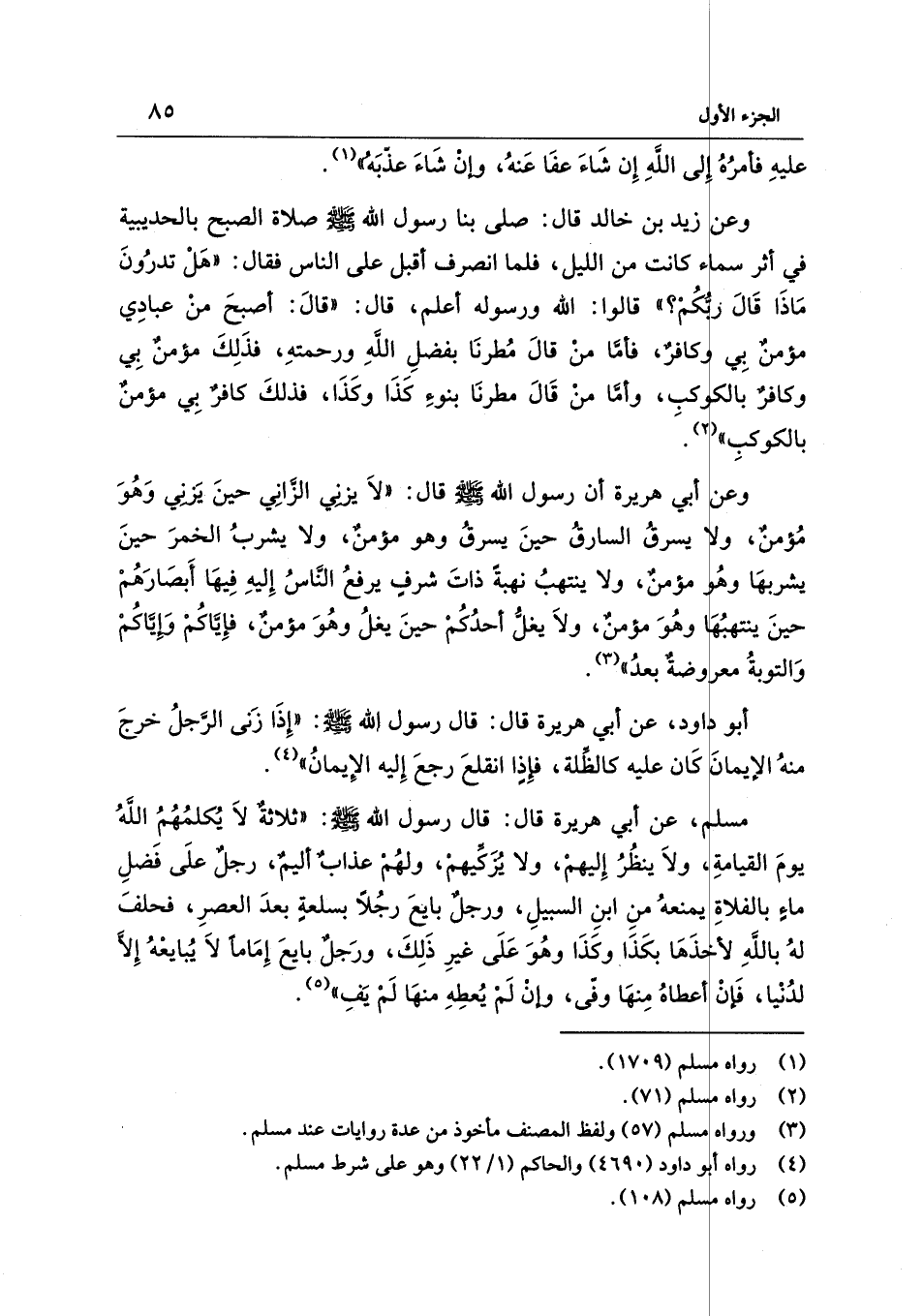 وعن زيد بن خالد قال: صلى بنا رسول الله - صلى الله عليه وسلم - صلاة الصبح بالحديبية في أثر سماء كانت من الليل، فلما انصرف أقبل على الناس فقال: "هَلْ تدرُونَ مَاذَا قَالَ ربُّكُمْ؟ " قالوا: الله ورسوله أعلم، قال: "قالَ: أصبحَ منْ عبادِي