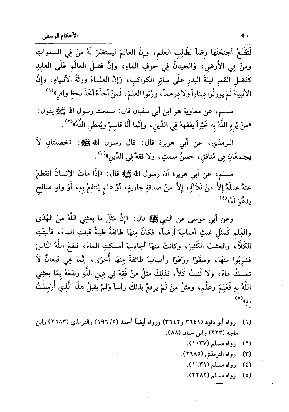 لَتَضَعُ أجنحَتَها رِضًا لطَالِبِ العلمِ، وإِنَّ العالمَ ليستغفرَ لَهُ منْ فِي السمواتِ ومنْ فِي الأَرضِ، وَالحيتانُ فِي جوفِ الماءِ، وَإنَّ فضلَ العالَم عَلَى العابِدِ كَفضلِ القمرِ ليلةَ البدرِ علَى سائِرِ الكواكبِ، وَإنَّ العلماءَ ورثَةُ الأنبياءِ، وإِنَّ الأنبياءَ لَمْ يورثُوا دِينارًا ولا دِرهمًا، ورَّثوا العلمَ، فَمنْ أخذَهُ أخَذَ بحظٍ وافرٍ" (¬1).