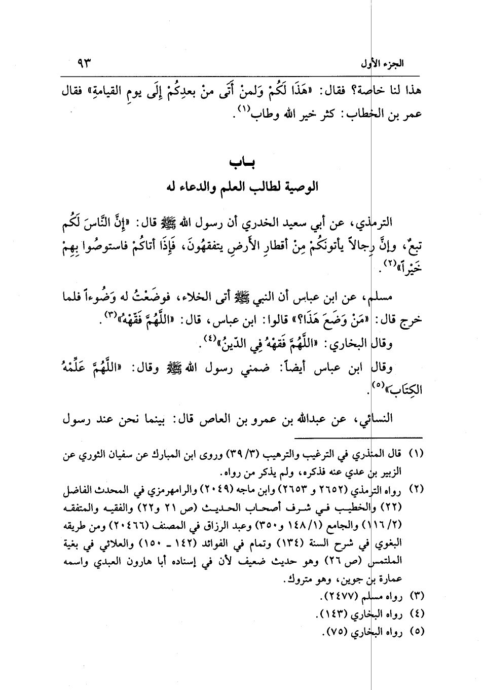 الترمذي، عن أبي سعيد الخدري أن رسول الله - صلى الله عليه وسلم - قال: "إِنَّ النَّاسَ لَكُم تبعٌ، وإنَّ رِجالًا يأتونَكُمْ مِنْ أقطارِ الأَرضِ يتفقهُونَ، فَإِذَا أتاكُمْ فاستوصُوا بِهِمْ خَيْرًا" (¬2).