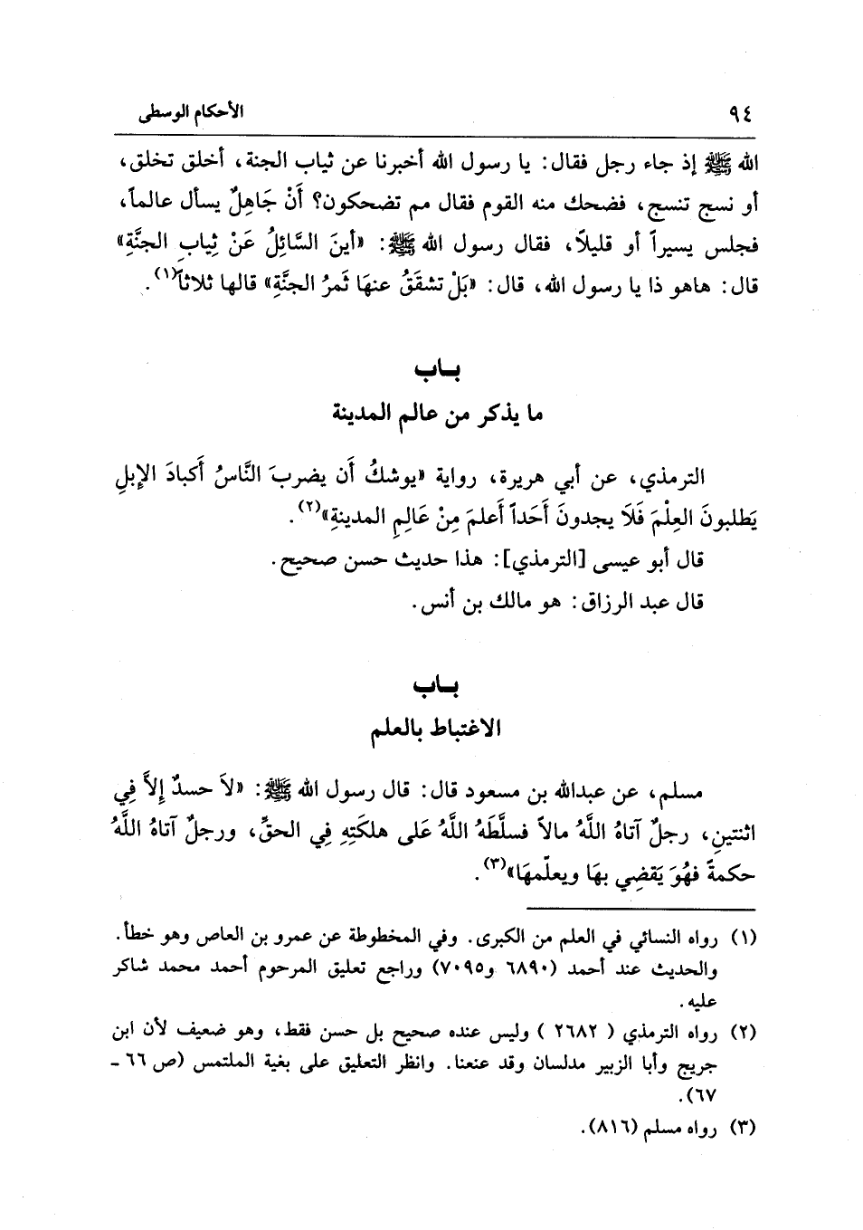 الترمذي، عن أبي هريرة، رواية "يوشكُ أَن يضربَ النَّاسُ أَكبادَ الإِبلِ يَطلبونَ العِلْمَ فَلاَ يجدونَ أَحَدًا أَعلمَ مِنْ عَالِمِ المدينةِ" (¬2).