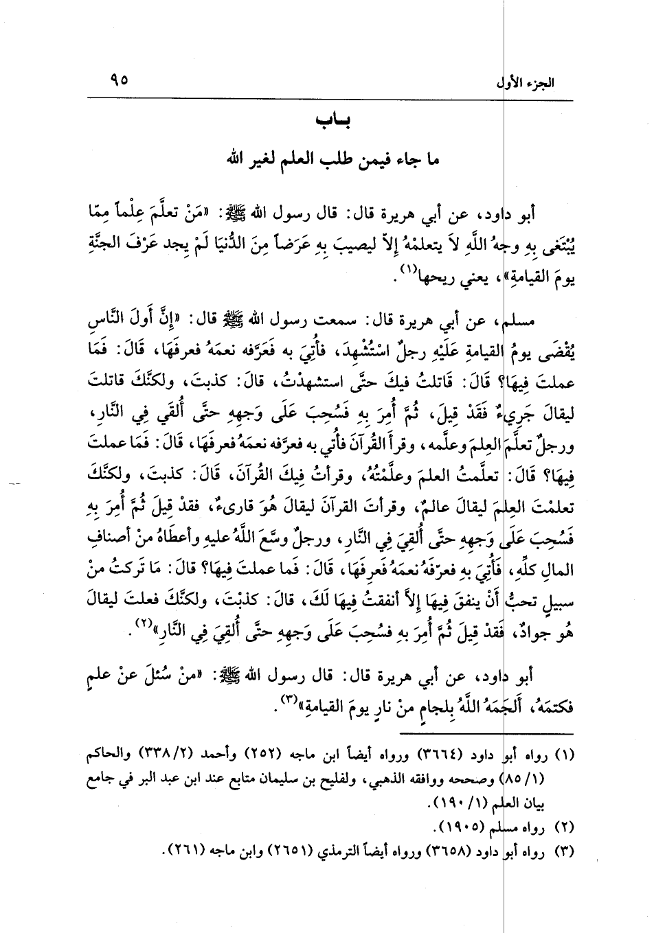أبو داود، عن أبي هريرة قال: قال رسول الله - صلى الله عليه وسلم -: "مَنْ تعلَّمَ عِلْمًا مِمّا يُبْتَغى بِهِ وُجهُ اللهِ لاَ يتعلمْهُ إِلّا ليصيبَ بِهِ عَرَضًا مِنَ الدُّنيَا لَمْ يِجد عَرْفَ الجنَّةِ يومَ القيامةِ"، يعني ريحها (¬1).