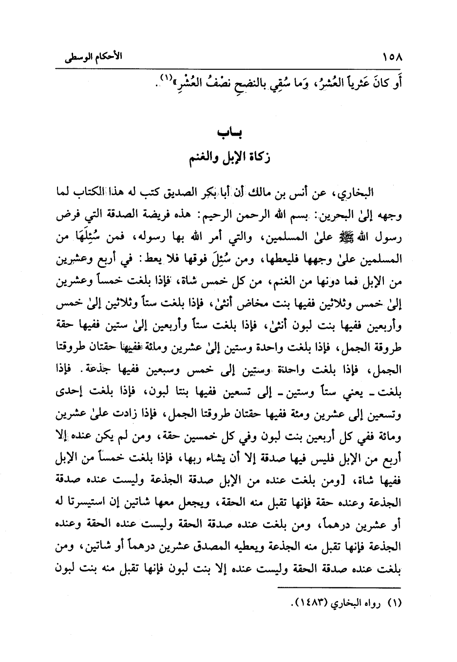 البخاري، عن أنس بن مالك أن؛ أبا: بكر الصديق كتب له هذا الكتاب لما وجهه إلى البحرين: بِسْمِ اللَّهِ الرَّحْمَنِ الرَّحِيمِ: هذه فريضة الصدقة التي فرض رسول الله - صلى الله عليه وسلم - على المسلمين، والتي أمر الله بها رسوله، فمن سُئِلَهَا من المسلمين على وجهها فليعطها، ومن سُئِلَ فوقها فلا يعط: في أربع وعشرين من الإبل فما دونها من الغنم، من كل خمس شاة، فإذا بلغت خمسًا وعشرين إلى خمس وثلاثين ففيه ابنت مخاض أنثى، فهذا بلغت ستا وثلاثين إلى خمس وأربعين ففيها بنت لبون أنثى، فهذا بلغت ستًا وأربعين إلى ستين ففيها حقة طروقة الجمل، فإذا بلغت واحدة وستين إلى عشرين ومائة فيها حقتان طروقتا الجمل، فإا بلغت واحدة وستين إلى خمس وسبعين ففيها جذعة. فإذا بلغت -يعني ستًا وستين- إلى تسعين ففيه ابنتا لبون، فإذا بلغت إحدى وتسعين إلى عشرين ومئة ففيها حقتان طروقتا الجمل، فهذا زادت على عشرين ومائة ففي كل أربعين بنت لبون وفي كل خمسين حقة، ومن لم يكن عنده إلا أربع من الإبل فليس فيها صدقة إلا أن يشاء ربها، فإذا بلغت خمسًا من الإبل