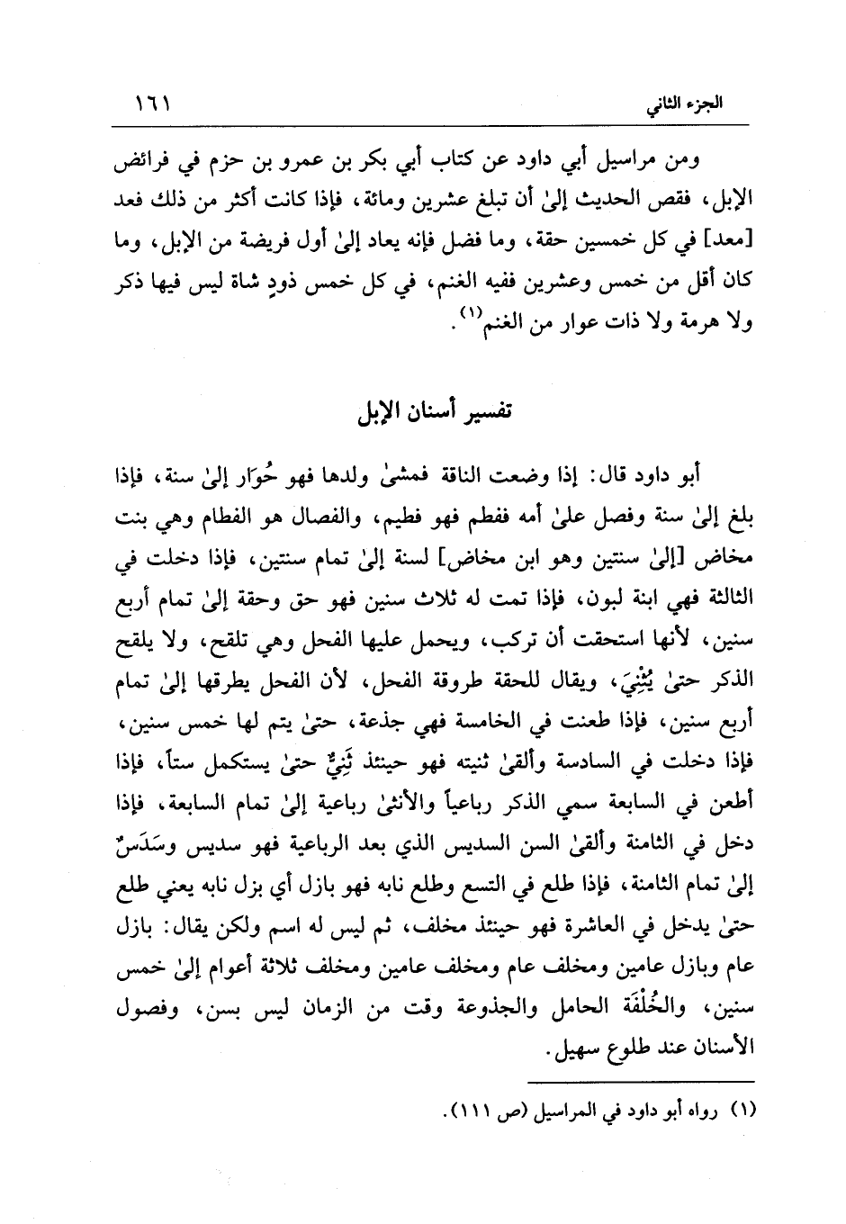 ومن مراسيل أبي داود عن كتاب أبي بكر بن عمرو بن حزم في فرائض الإبل، فقص الحديث إلى أن تبلغ عشرين ومائة، فإذا كانت أكثر من ذلك فعد [معد] في كل خمسين حقة، وما فضل فإنه يعاد إلى أول فريضة من الإبل، وما كان أقل من خمس وعشرين ففيه الغنم، في كل خمس ذودٍ شاة ليس فيها ذكر ولا هرمة ولا ذات عوار من الغنم (¬1).