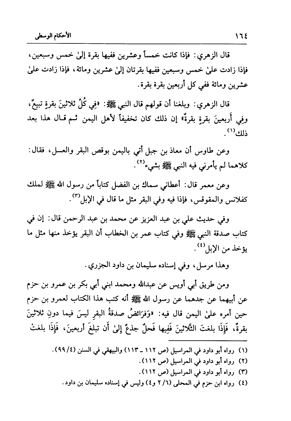 ومن طريق أبي أويس عن عبد الله ومحمد ابني أبي بكر بن عمرو بن حزم عن أبيهما عن جدهما عن رسول الله - صلى الله عليه وسلم - أنه كتب هذا الكتاب لعمرو بن حزم حين أمره على اليمن قال فيه: "وَفرَائضُ صدقةُ البقرِ ليسَ فيما دونِ ثلاثينَ بقرةٌ، فَإذَا بلغتَ الثلاثينَ فَفِيها فَحلٌ جذعٌ إِلى أَن تبلغَ أربعينَ، فَإِذَا بلغتْ