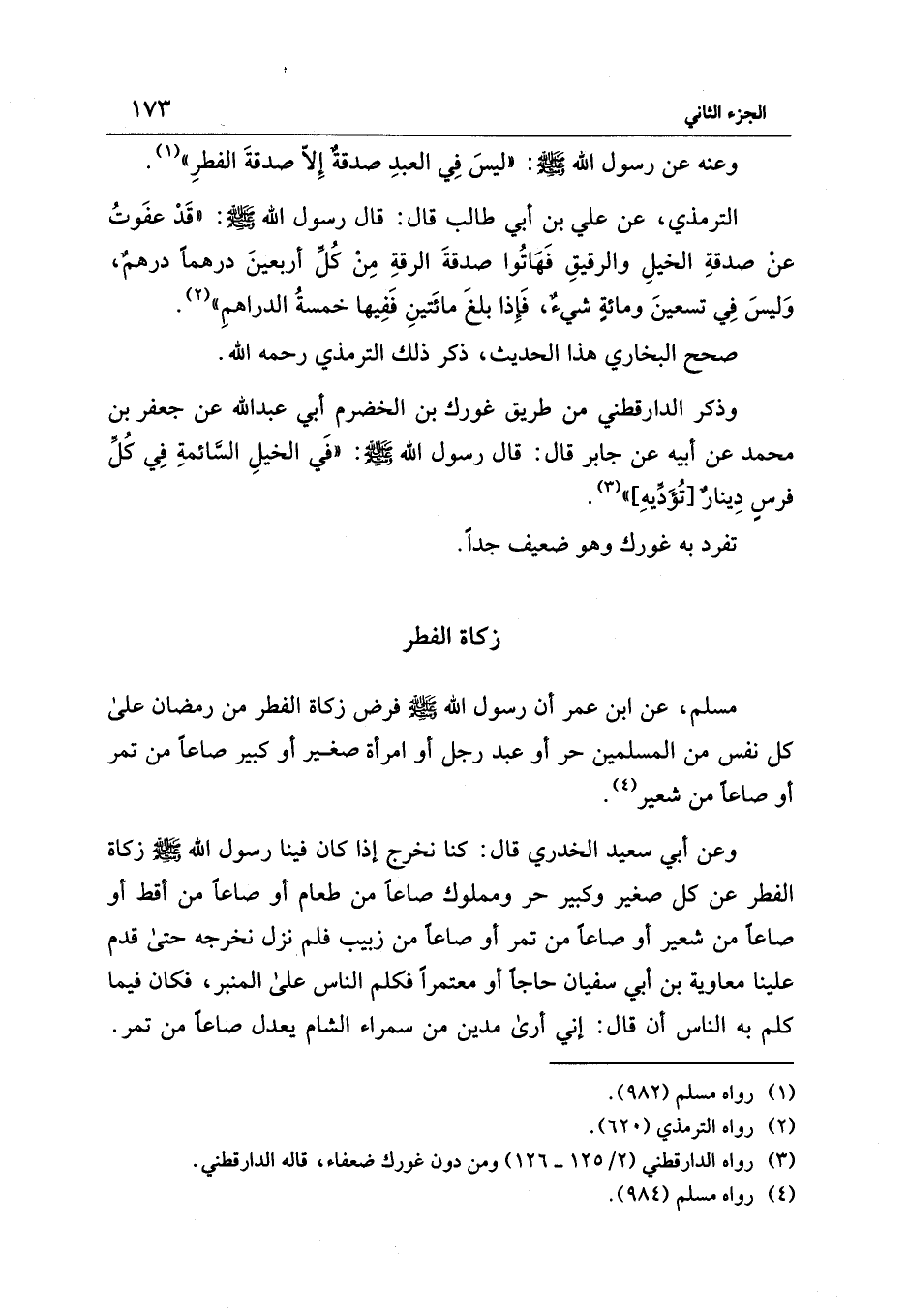 الترمذي، عن علي بن أبي طالب قال: قال رسول الله - صلى الله عليه وسلم -: "قَدْ عفَوتُ عنْ صدقةِ الخيلِ والرقيقِ فَهَاتُوا صدقةَ الرقةِ مِنْ كُل أربعينَ درهمًا درهمٌ، وَليسَ في تسعينَ ومائةٍ شيءٌ، فَإذا بلغَ مائَتينِ فَفِيها خمسةُ الدراهمِ" (¬2).