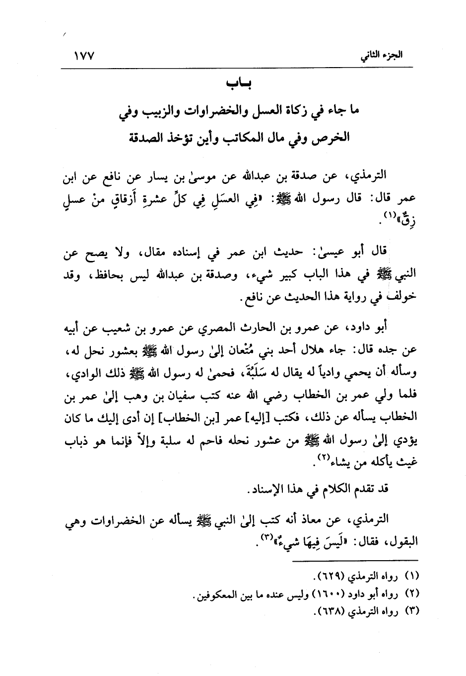 الترمذي، عن صدقة بن عبد الله عن موسى بن يسار عن نافع عن ابن عمر قال: قال رسول الله - صلى الله عليه وسلم -: "فِي العسَلِ في كلِّ عشرة أَزقاقٍ منْ عسلٍ زِقٌ" (¬1).