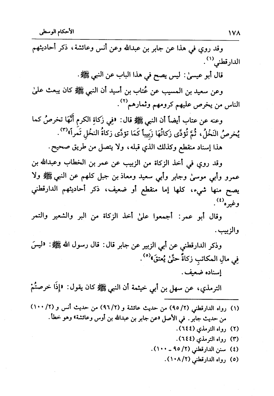 وقد روي في أخذ الزكاة من الزبيب عن عمر بن الخطاب وعبد الله بن عمرو وأبي موسى وجابر وأبي سعيد ومعاذ بن جبل كلهم عن النبي - صلى الله عليه وسلم - ولا يصح منها شيء، كلها إما منقطع أو ضعيف، ذكر أحاديثهم الدارقطني وغيره (¬4).