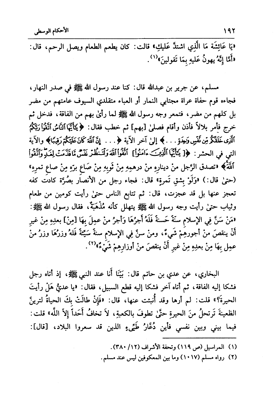 مسلم، عن جرير بن عبد الله قال: كنا عند رسول الله - صلى الله عليه وسلم - في صدر النهار، فجاءه قوم حفاة عراة مجتابي النمار أو العباء متقلدي السيوف عامتهم من مضر بل كلهم من مضر، فتمعر وجه رسول الله - صلى الله عليه وسلم - لما رأى بهم من الفاقة، فدخل ثم خرج فأمر بلالًا فأذن وأقام فصلى [بهم] ثم خطب فقال: {يَاأَيُّهَا النَّاسُ اتَّقُوا رَبَّكُمُ الَّذِي خَلَقَكُمْ مِنْ نَفْسٍ وَاحِدَةٍ. . .} إلى آخر الآية {إِنَّ اللَّهَ كَانَ عَلَيْكُمْ رَقِيبًا} والآية التى في الحشر: {[يَاأَيُّهَا الَّذِينَ آمَنُوا] اتَّقُوا اللَّهَ وَلْتَنْظُرْ نَفْسٌ مَا قَدَّمَتْ لِغَدٍ وَاتَّقُوا اللَّهَ} "تصدق الرَّجل منْ دينارِهِ منْ درهمِهِ مِنْ ثَوبِهِ مِنْ صَاعِ برّهِ مِنْ صاعِ تمرِهِ"، (حتى قال:) "وَلَوْ بِشقِ تَمرةٍ" قال: فجاء رجل من الأنصار بصُرَّة كادت كفه تعجز عنها بل قد عجزت، قال: ثم تتابع الناس حتى رأيت كومين من طعام وثياب حتى رأيت وجه رسول الله - صلى الله عليه وسلم - يتهلل كأنه مُذْهَبَةٌ، فقال رسول الله - صلى الله عليه وسلم -: "مَنْ سَنَّ فِي الإِسلامِ سنّةً حَسنةً فَلَهُ أَجرُهَا وَأجرُ منْ عمِلَ بِهَا [مِنْ] بعدِهِ مِنْ غيرِ أَنْ ينقصَ منْ أجورهِمْ شَيءٌ, ومنْ سنَّ فِي الإِسلامِ سنةً سَيِّئةَ فَلهُ وزرُهَا وزرُ منْ عمِل بِهَا مِنْ بعدِهِ مِنْ غيرِ أَنْ ينقصَ منْ أوزارِهِمْ شَيْءٌ" (¬2).