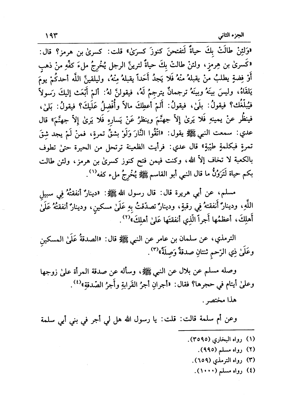 "وَلئِنْ طالَتْ بِكَ حياةٌ لَتفتحنَ كنوزَ كسرَى" قلت: كسرى بن هرمز؟ قال: "كَسرى بن هِرمزٍ، ولئنْ طالتْ بِكَ حياةٌ لترينَّ الرجل يُخْرِجُ ملءَ كفِّهِ منْ ذهبٍ أَوْ فِضةٍ يطلبُ منْ يقبلهُ منْهُ فَلا يَجدُ أَحَدًا يقبلهُ مِنْهُ، وليلقينَّ الله أحدكُمْ يومَ يَلقَاهُ، وليسَ بينَهُ وبينَهُ ترجمانٌ يترجمُ لَهُ، فيقولنَّ لهُ: ألمْ أَبْعَث إليكَ رَسولًا فيُبلّغُك؟ فيقولُ: بلَى، فيقولُ: أَلمْ أعطِكَ مالًا وأُفْضِلُ عَلَيكَ؟ فيقولُ: بَلى، فينظُر عنْ يمينهِ فَلا يَرى إِلّا جهنَّمَ وينظرُ عَنْ يَسارِهِ فَلا يَرى إِلّا جهنَّمَ" قال عدي: سمعت النبي - صلى الله عليه وسلم - يقول: "اتّقُوا النَّارَ وَلَوْ بشقِّ تمرةٍ، فمنْ لَمْ يجد شِقَ تمرةٍ فبكلمةٍ طيّبةٍ" قال عدي: فرأيت الظعينة ترتحل من الحيرة حتى تطوف بالكعبة لا تخاف إلّا الله، وكنت فيمن فتح كنوز كسرى بن هرمز، ولئن طالت بكم حياة لَتَرَوُنُّ ما قال النبي أبو القاسم - صلى الله عليه وسلم - يُخْرِجُ ملء كفه (¬1).