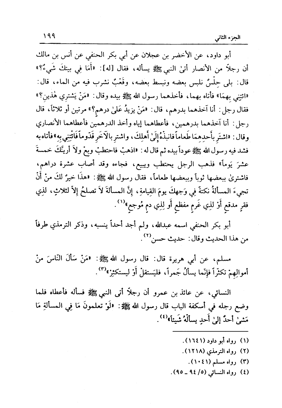 أبو داود، عن الأخضر بن عجلان عن أبي بكر الحنفي عن أنس بن مالك أن رجلًا من الأنصار أتى النبي - صلى الله عليه وسلم - يسأله، فقال [له]: "أَمَا فِي بيتكَ شَيءٌ؟ " قال. بلى حِلْسٌ نلبس بعضه ونبسط بعضه، وقَعْبٌ نشرب فيه من الماء، قال: "ائتنِي بِهمَا" فأتاه بهما، فأخذهما رسول الله - صلى الله عليه وسلم - بيده وقال: "مَنْ يَشترِي هذينِ؟ " فقال رجل: أنا آخذهما بدرهم، قال: "مَنْ يزيدُ عَلى درهمٍ؟ " مرتين أو ثلاثًا، قال رجل: أنا آخذهما بدرهمين، فأعطاهما إياه وأخذ الدرهمين فأعطاهما الأنصاري وقال: "اشتَرِ بأَحدِهِمَا طَعامًا فانبذْهُ إِلَى أَهلِكَ، واشترِ بالآخَرِ قَدّومًا فَائْتِنِي بِهِ" فأتاه به فشد فيه رسول الله - صلى الله عليه وسلم - عودًا بيده ثم قال له: "اذهبْ فاحتطبْ وبِعْ ولاَ أرينَّكَ خمسةَ عشرَ يَومًا" فذهب الرجل يحتطب ويبيع، فجاءه وقد أصاب عشرة دراهم، فاشترى ببعضها ثوبًا وببعضها طعامًا، فقال رسول الله - صلى الله عليه وسلم -: "هذَا خيرٌ لكَ منْ أَنْ تجيءَ المسألةُ نكتةً فِي وَجهكَ يومَ القِيامةِ، إِنَّ المسألةَ لاَ تصلحُ إِلّا لثلاثٍ، لذِي فقرٍ مدقعٍ أَوْ لذِي غَرمٍ مفظعٍ أَو لِذِي دمٍ مُوجعٍ" (¬1).