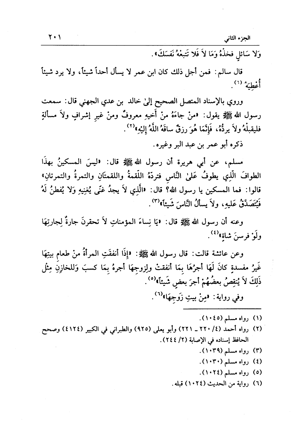 مسلم، عن ألي هريرة أن رسول الله - صلى الله عليه وسلم - قال: "ليسَ المسكينُ بهذَا الطوافَ الّذِي يطوفُ عَلى النَّاسِ فتردّهُ اللّقمةُ واللقمتَانِ والتمرةُ والتمرتانِ" قالوا: فما المسكين يا رسول الله؟ قال: "الَّذِي لاَ يجدُ غنًى يُغنِيهِ وَلا يُفطنُ لَهُ فَيُتَصَدَّقُ عَليهِ، ولاَ يسألُ النَّاسَ شَيئًا" (¬3).