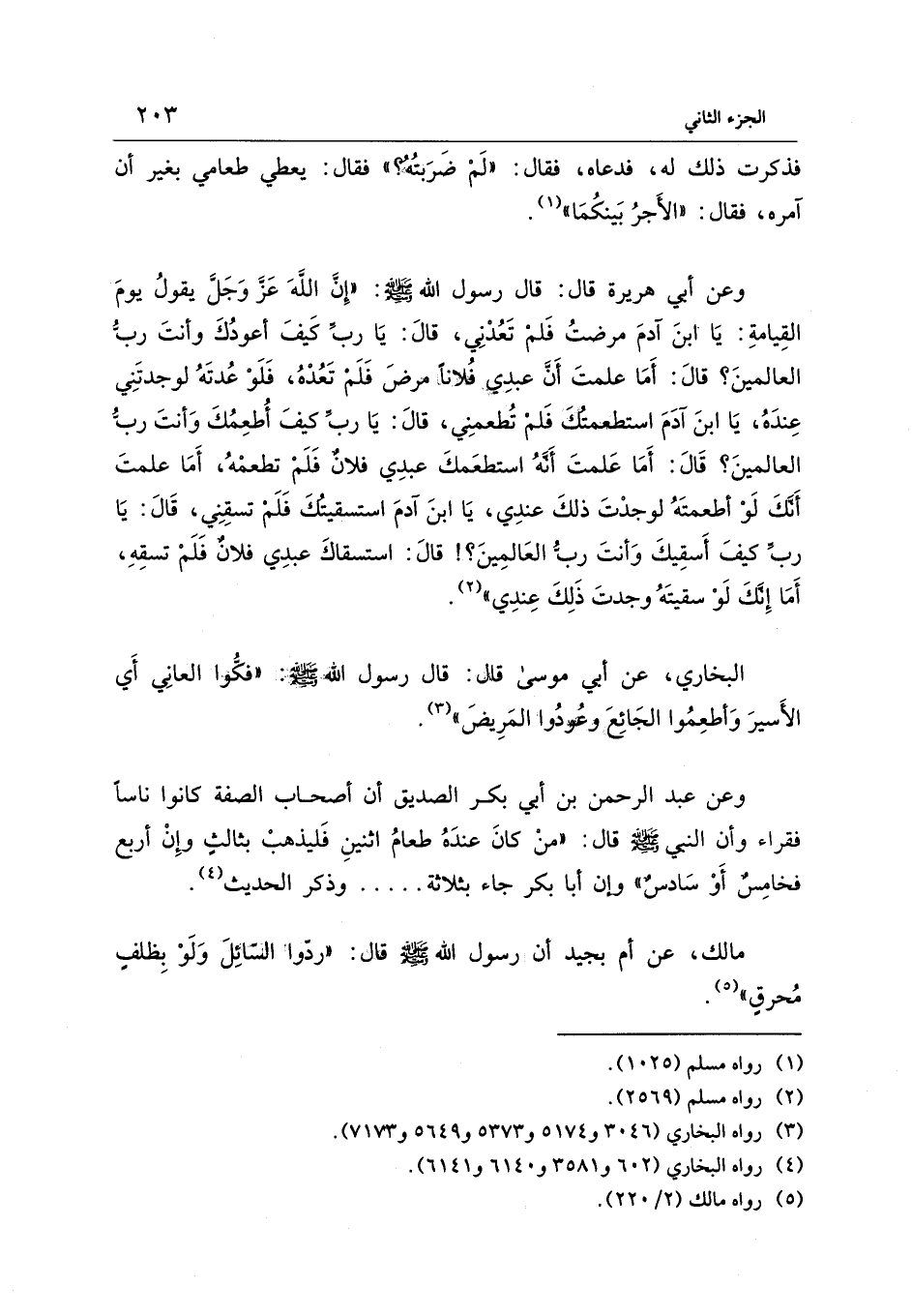 وعن أبي هريرة قال: قال رسول الله - صلى الله عليه وسلم -: "إِنَّ اللهَ عَزَّ وَجَلَّ يقولُ يومَ القِيامةِ: يَاْ ابنَ آدمَ مرضتُ فَلمْ تَعُدْنِي، قالَ: يَا ربِّ كَيفَ أعودُكَ وأنتَ ربُّ العالمينَ؟ قالَ: أَمَا علمتَ أَنَّ عبدِي فُلانًا مرضَ فَلَمْ تَعُدْهُ، فَلَوْ عُدتَهُ لوجدتَنِي عِندَهُ، يَا ابنَ آدَمَ استطعمتكَ فَلمْ تُطعمنِي، قالَ: يَا ربِّ كيفَ أُطعِمُكَ وَأنتَ ربُّ العالمينَ؟ قَالَ: أَمَا عَلمتَ أَنَّهُ استطعَمكَ عبدِي فلانٌ فَلَمْ تطعمْهُ، أَمَا علمتَ أَنَّكَ لَوْ أطعمتَهُ لوجدْتَ ذلكَ عندِي، يَا ابنَ آدمَ استسقيتُكَ فَلَمْ تسقِنِي، قَالَ: يَا ربِّ كيفَ أَسقِيكَ وَأنتَ ربُّ العَالمِينَ؟! قالَ: استسقاكَ عبدِي فلانٌ فَلَمْ تسقِهِ، أَمَا إِنَّكَ لَوْ سقيتَهُ وجدتَ ذَلِكَ عِندِي" (¬2).