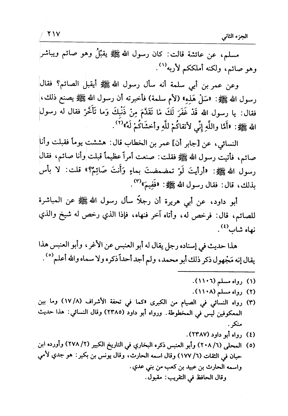 أبو داود، عن أبي هريرة أن رجلًا سأل رسول الله - صلى الله عليه وسلم - عن المباشرة للصائم، قال: فرخص له، وأتاه آخر فنهاه، فإذا الذي رخص له شيخ والذي نهاه شاب (¬4).
