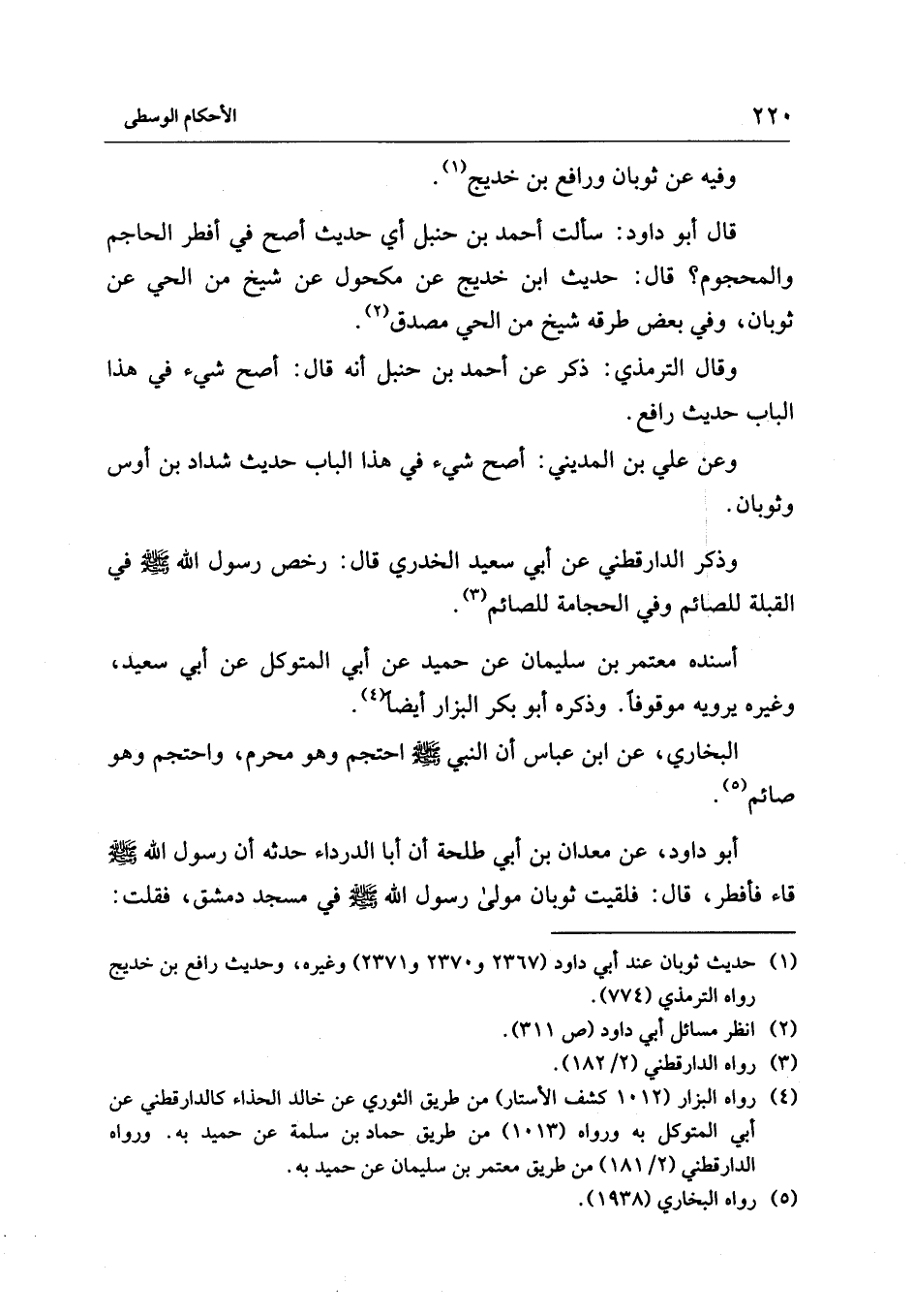 قال أبو داود: سألت أحمد بن حنبل أي حديث أصح في أفطر الحاجم والمحجوم؟ قال: حديث ابن خديج عن مكحول عن شيخ من الحي عن ثوبان، وفي بعض طرقه شيخ من الحي مصدق (¬2).