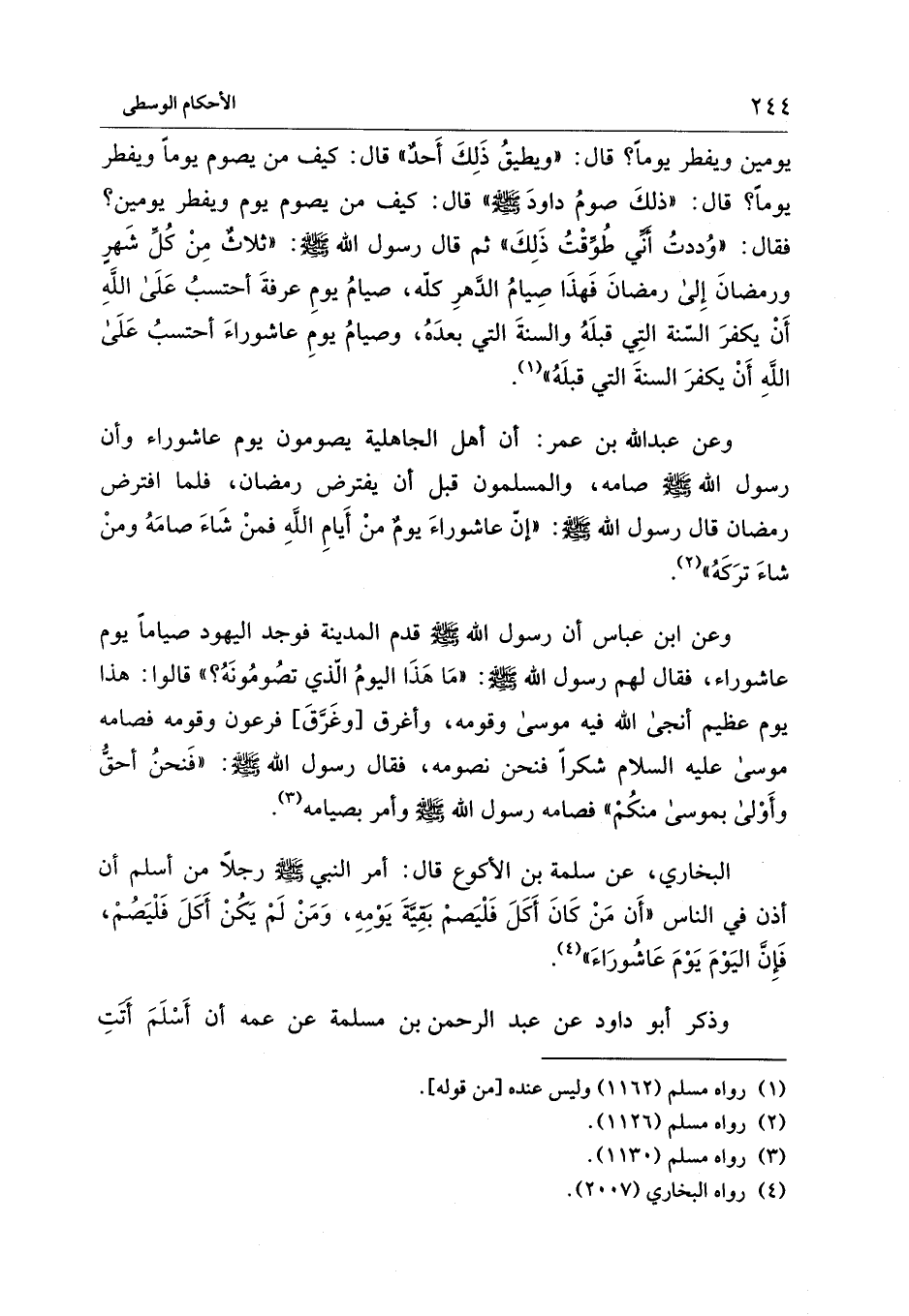 البخاري، عن سلمة بن الأكوع قال: أمر النبي - صلى الله عليه وسلم - رجلًا من أسلم أن أذن في الناس "أَن مَنْ كَانَ أَكَلَ فَلْيَصمْ بَقِيَّةَ يَوْمِهِ، وَمَنْ لَمْ يَكُنْ أَكَلَ فَلْيَصُمْ، فَإِنَّ اليَوْمَ يَوْمَ عَاشُورَاءَ" (¬4).