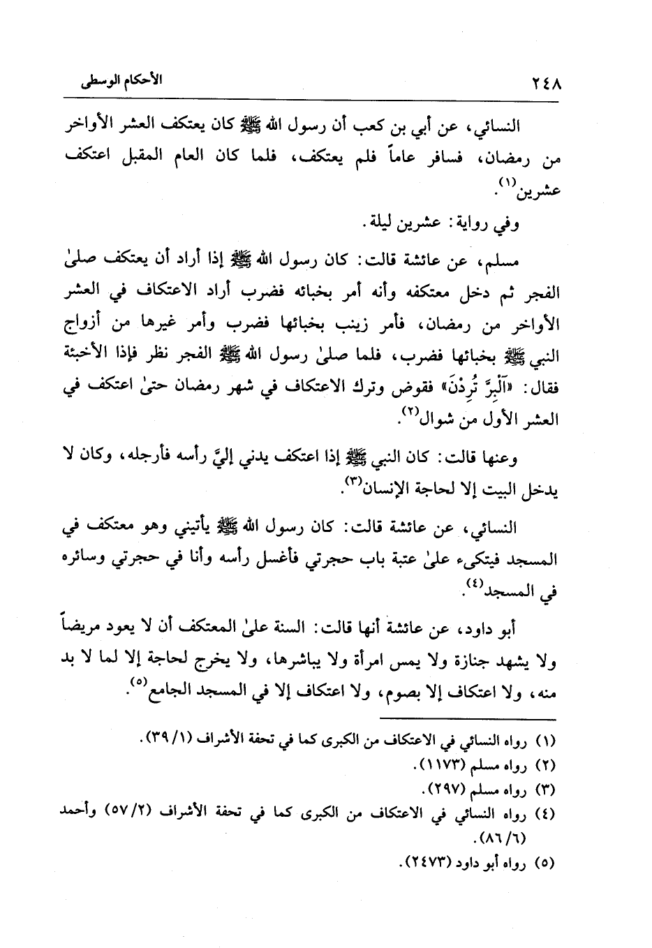 أبو داود، عن عائشة أنها قالت: السنة على المعتكف أن لا يعود مريضًا ولا يشهد جنازة ولا يمس امرأة ولا يباشرها، ولا يخرج لحاجة إلا لما لا بد منه، ولا اعتكاف إلا بصوم، ولا اعتكاف إلا في المسجد الجامع (¬5).