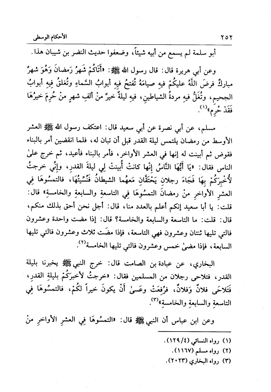 مسلم، عن أبي نصرة عن أبي سعيد قال: اعتكف رسول الله - صلى الله عليه وسلم - العشر الأوسط من رمضان يلتمس ليلة القدر قبل أن تبان له، فلما انقضين أمر بالبناء فقوض ثم أبينت له إنها في العشر الأواخر، فأمر بالبناء فأعيد، ثم خرج على الناس فقال: "يَا أَيُّهَا النَّاسُ إِنّها كانتْ أُبينتْ لِي ليلةَ القدرِ، وإِنِّي خرجتُ لأُخْبِرَكُمْ بِهَا فَجَاءَ رجلانِ يَحْتَقَّانِ مَعهُما الشيطانُ فَنُسِّيتُهَا، فالتمسُوهَا فِي العشرِ الأواخرِ منْ رمضانَ التمسُوهَا فِي التاسعةِ والسابعةِ والخامسةِ" قال: قلت: يا أبا سعيد إنكم أعلم بالعدد منا، قال: أجل نحن أحق بذلك منكم، قال: قلت: ما التاسعة والسابعة والخامسة؟ قال: إذا مضت واحدة وعشرون فالتي تليها ثنتان وعشرون فهي التاسعة، فاذا مضَت ثلاث وعشرون فالتي تليها السابعة، فإذا مضى خمس وعشرون فالتي تليها الخامسة (¬2).