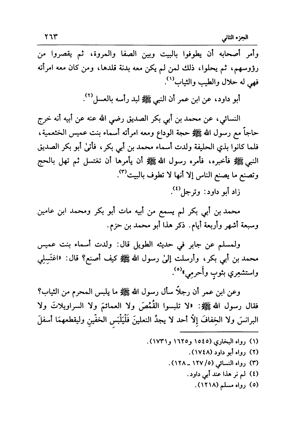 النسائي، عن محمد بن أبي بكر الصديق رضي الله عنه عن أبيه أنه خرج حاجًا مع رسول الله - صلى الله عليه وسلم - حجة الوداع ومعه امرأته أسماء بنت عميس الخثعمية، فلما كانوا بذي الحليفة ولدت أسماء محمد بن أبي بكر، فأتى أبو بكر الصديق النبي - صلى الله عليه وسلم - فأخبره، فأمره رسول الله - صلى الله عليه وسلم - أن يأمرها أن تغتسل ثم تهل بالحج وتصنع ما يصنع الناس إلا أنها لا تطوف بالبيت (¬3).