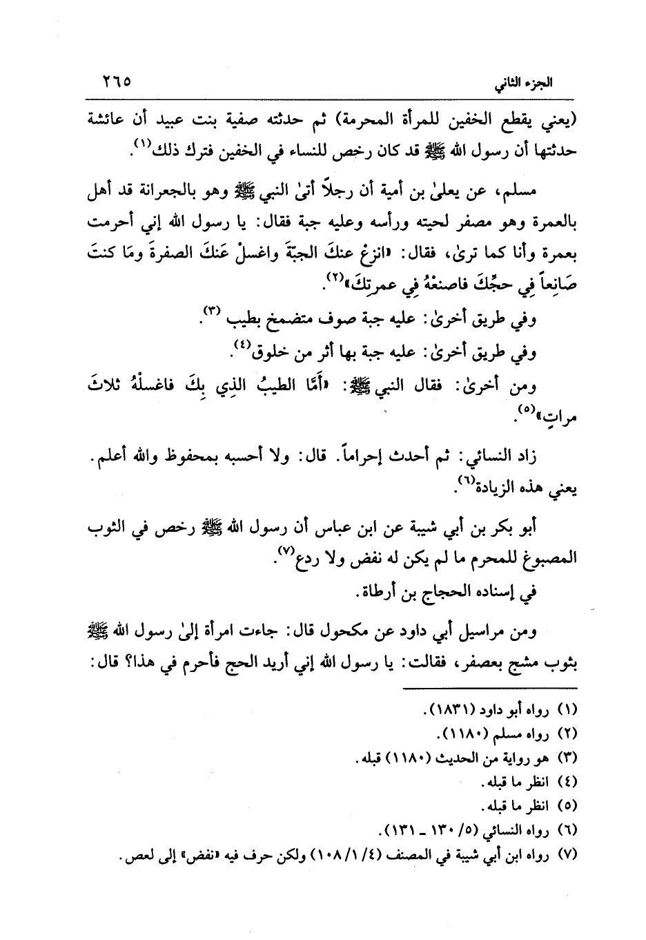 مسلم، عن يعلى بن أمية أن رجلًا أتى النبي - صلى الله عليه وسلم - وهو بالجعرانة قد أهل بالعمرة وهو مصفر لحيته ورأسه وعليه جبة فقال: يا رسول الله إني أحرمت بعمرة وأنا كما ترى، فقال: "انزعْ عنكَ الجبّةَ واغسلْ عَنكَ الصفرةَ ومَا كنتَ صَانِعًا فِي حجِّكَ فاصنعْهُ فِي عمرتِكَ" (¬2).
